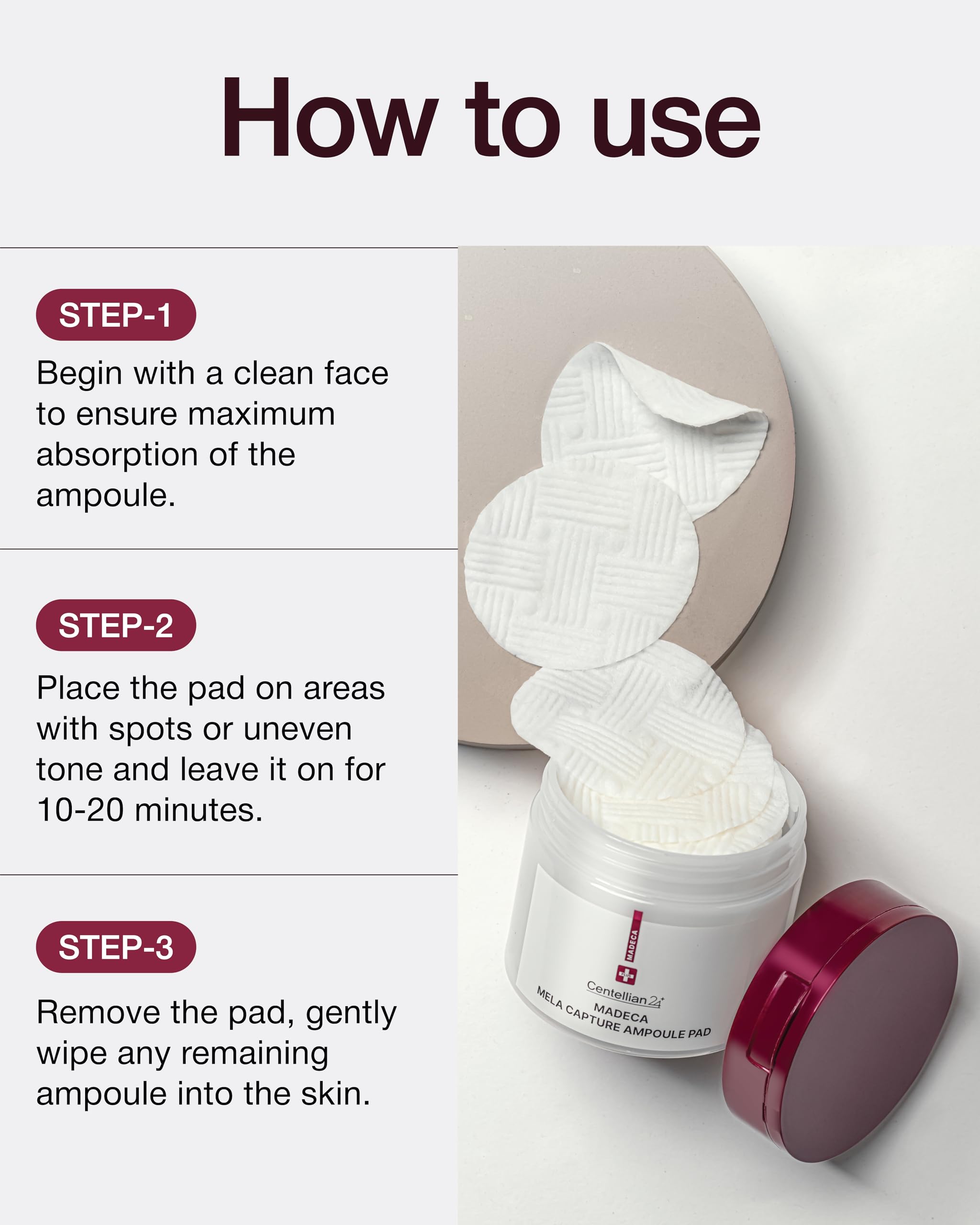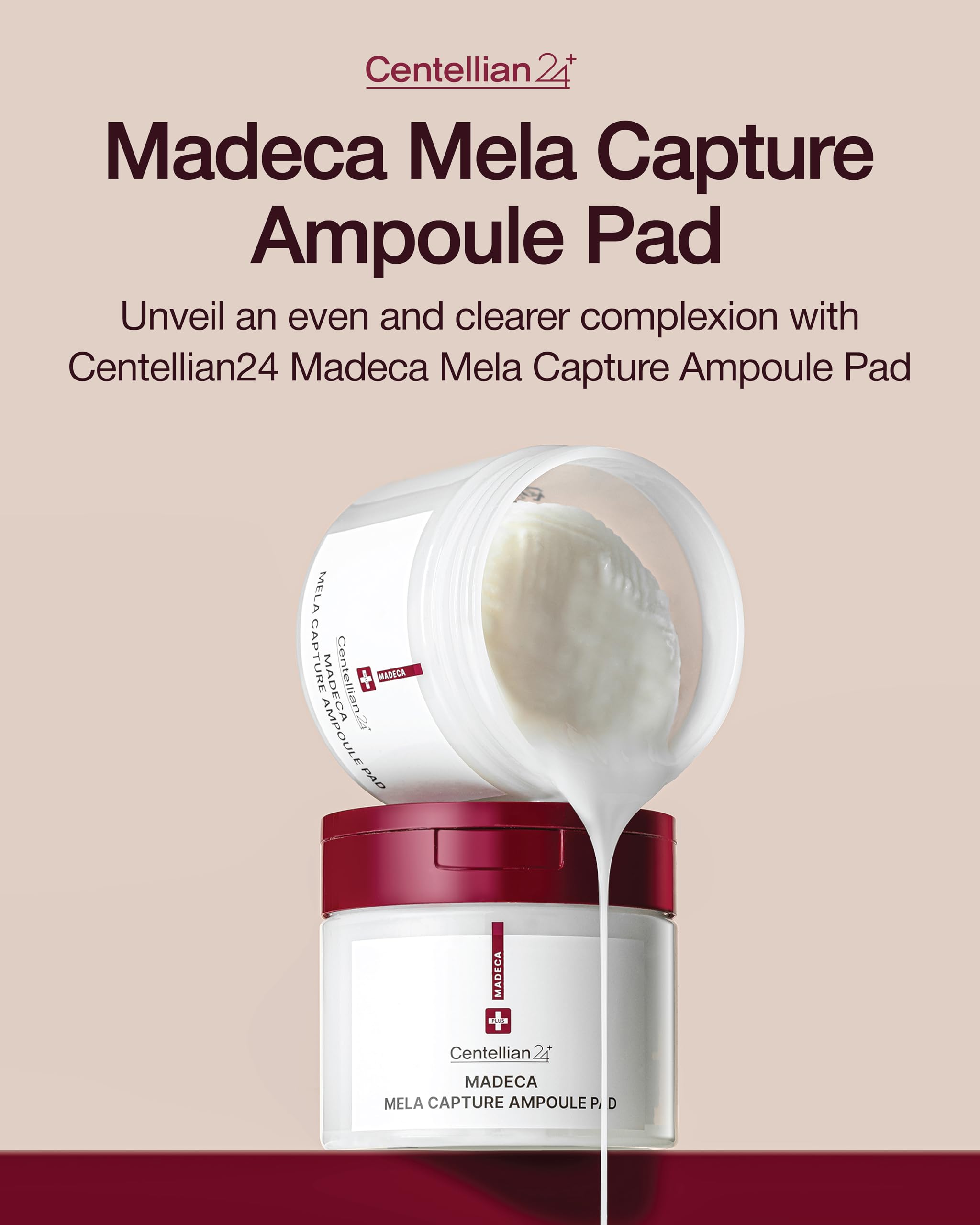 CENTELLIAN 24 MADECA MELA CAPTURE AMPOULE PAD (165ml,/60 pcs) - Targets melanin at its source to visibly reduce blemishes, leaving your skin with a clearer, more even complexion. Infused with MadeWhiteMax and three patented melanin-reducing technologies for fast, visible results.