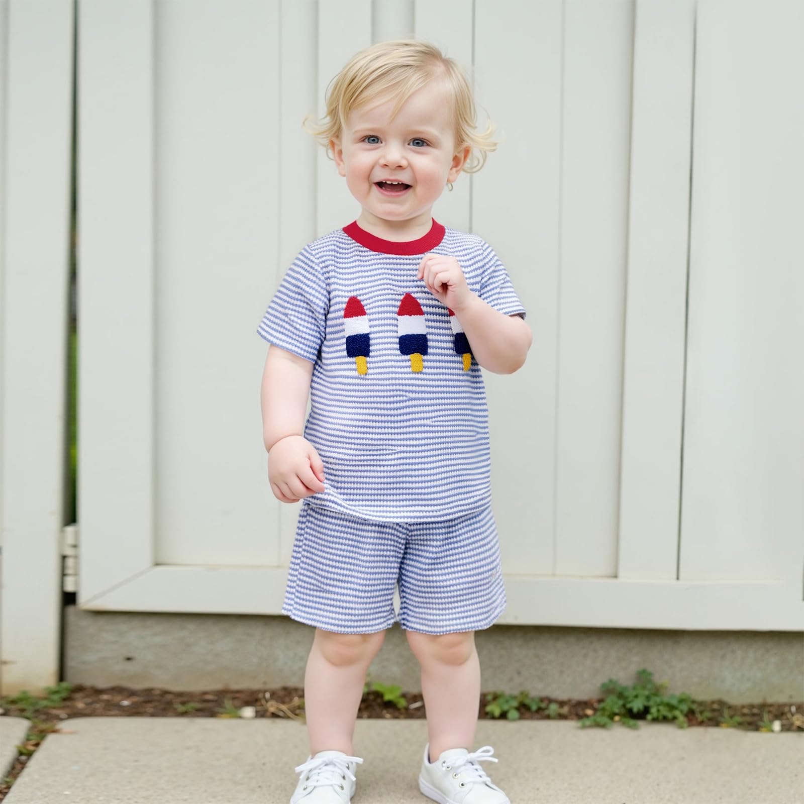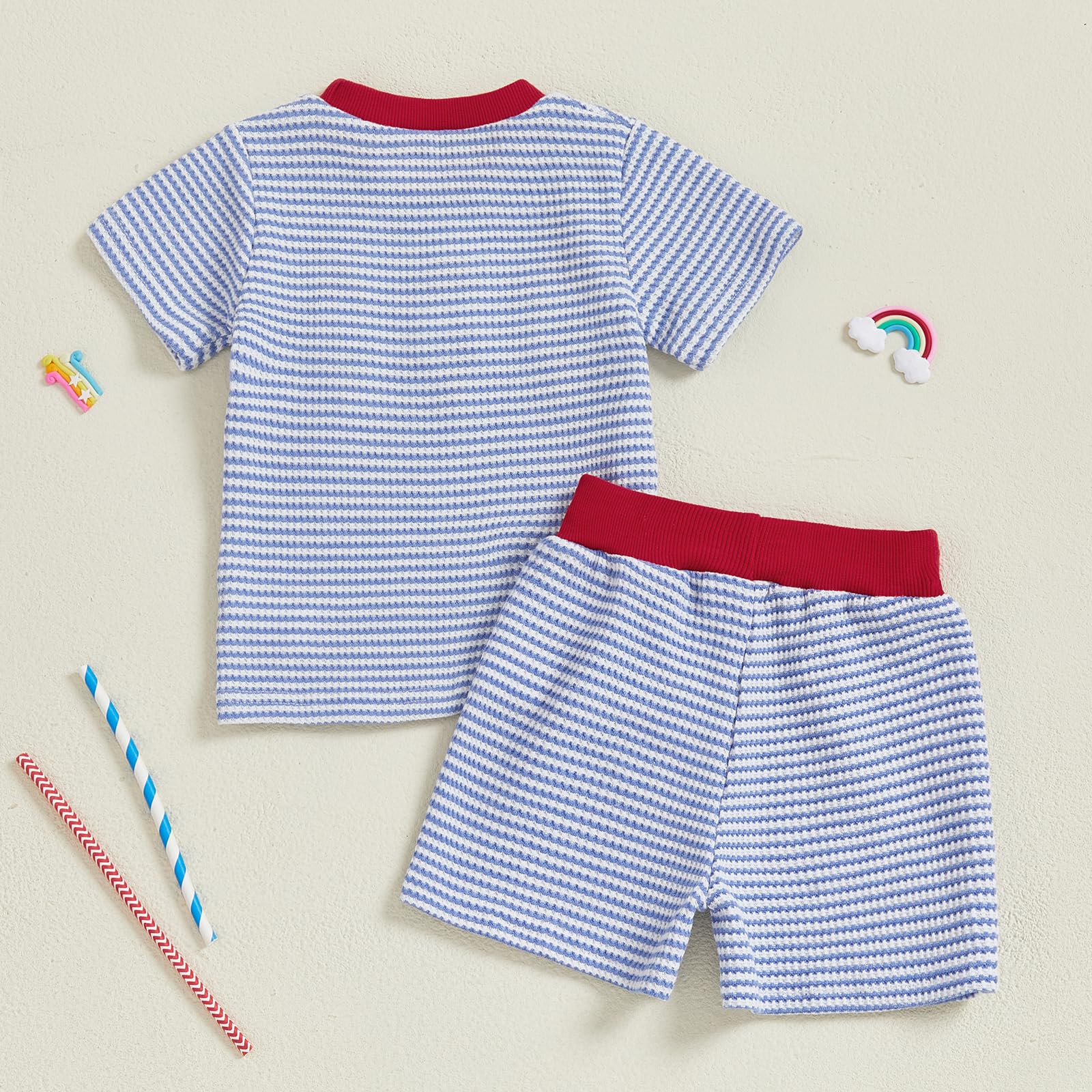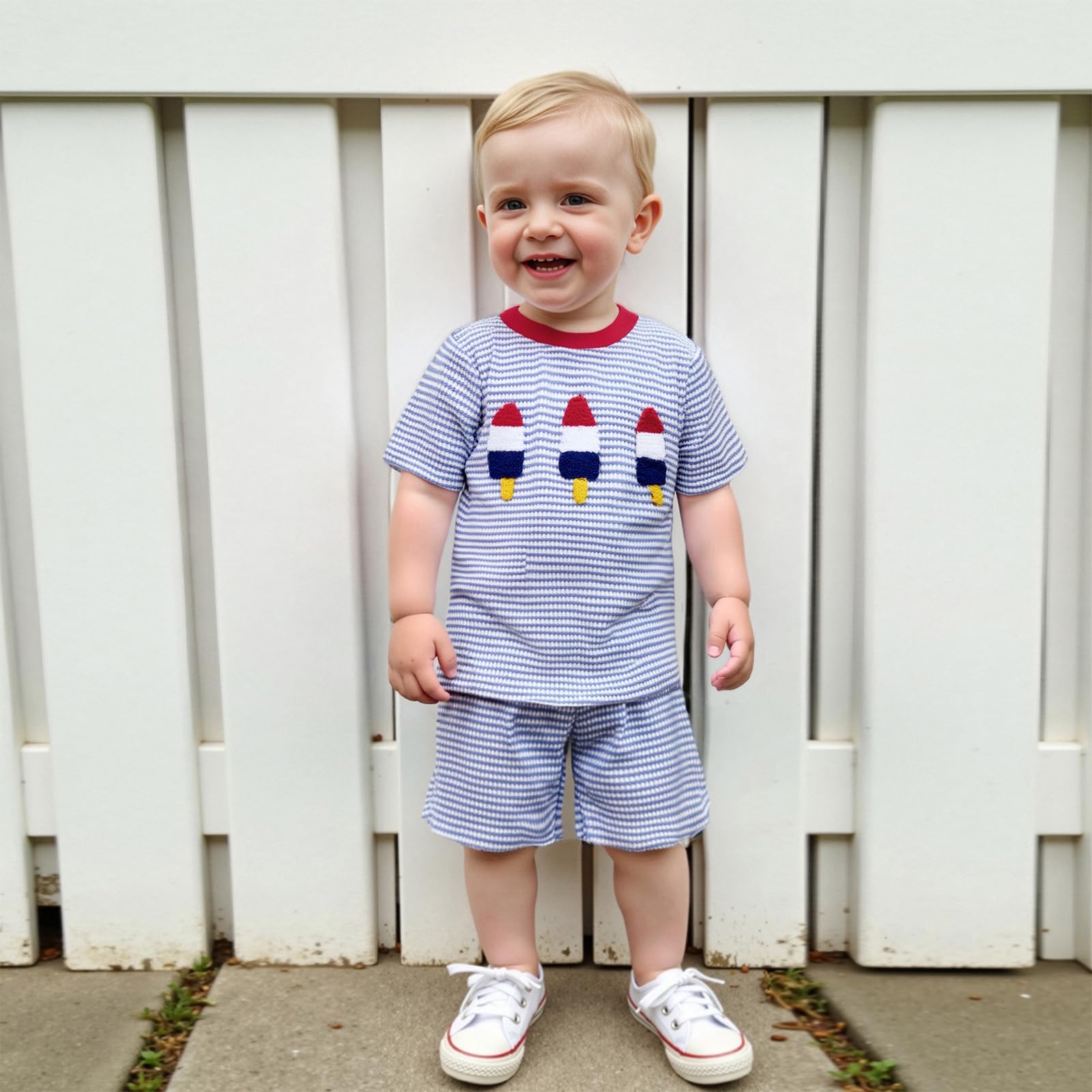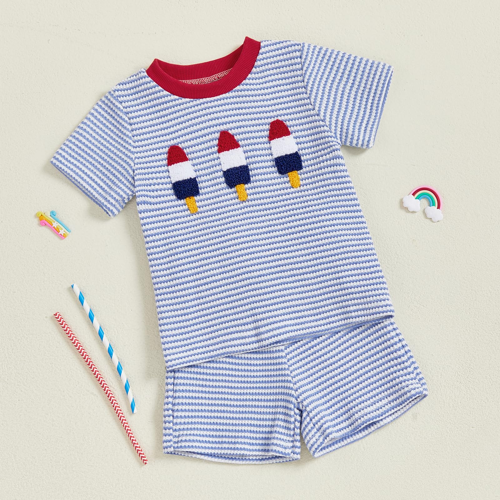 DESIGNS: 4th of July toddler boy clothes; Baby boys tops uses ice cream embroidery, round neck, short sleeve design; Elastic waist shorts with stripe design; Bright colors make the baby look cute and lovely