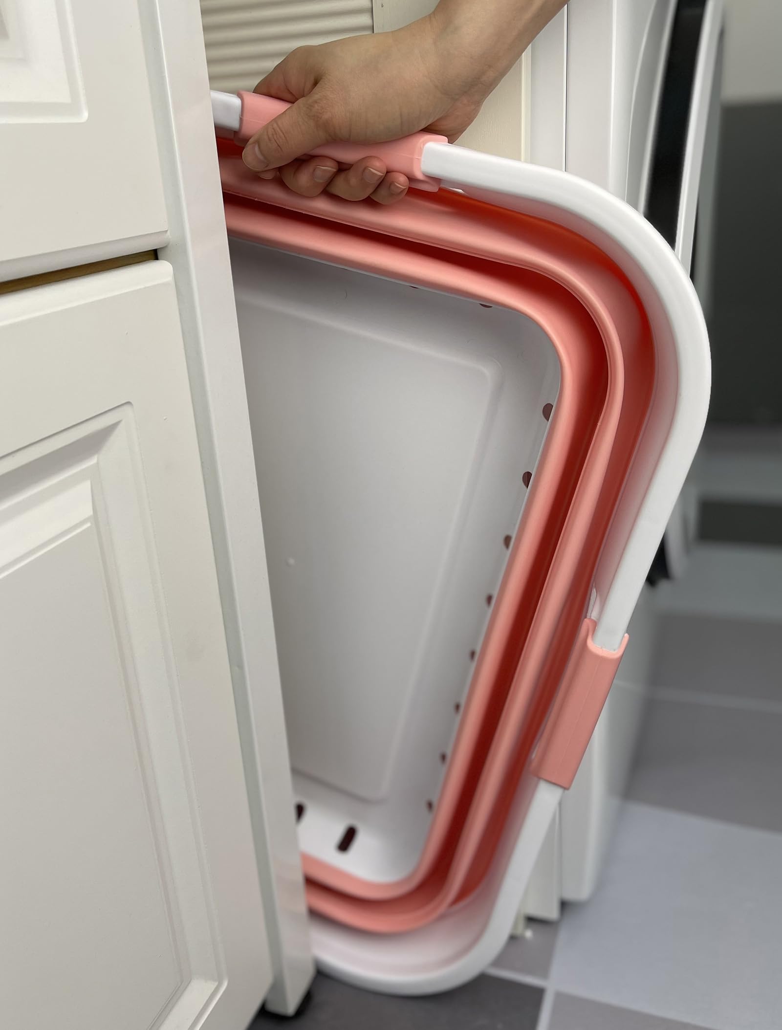BPA Free. Comfort grip handles for easy carry. User friendly by simply pop-up to open when using and collapses to flat for space saving