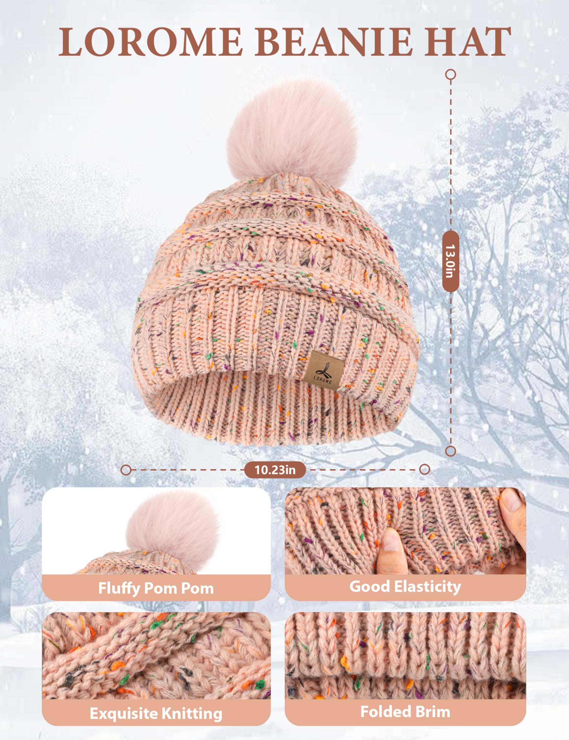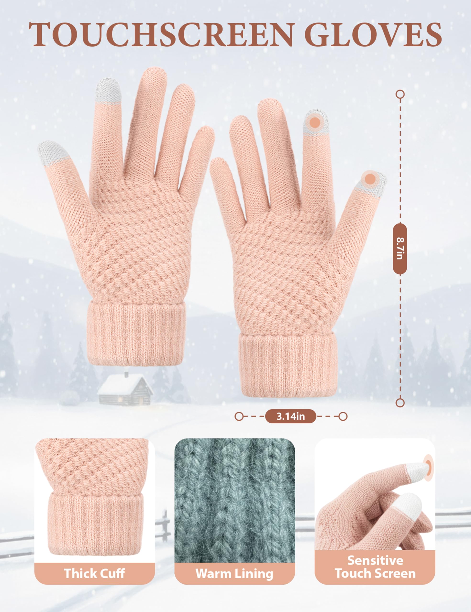 What You will Get -- 1 set pinkish mottled color womens winter set that includes1 PCS womens beanie hat with pom-pom, 1 PCS scarf for women, 1 Pair touch screen gloves and 1 PCS padded winter ear muffs, suitable for winter accessories.