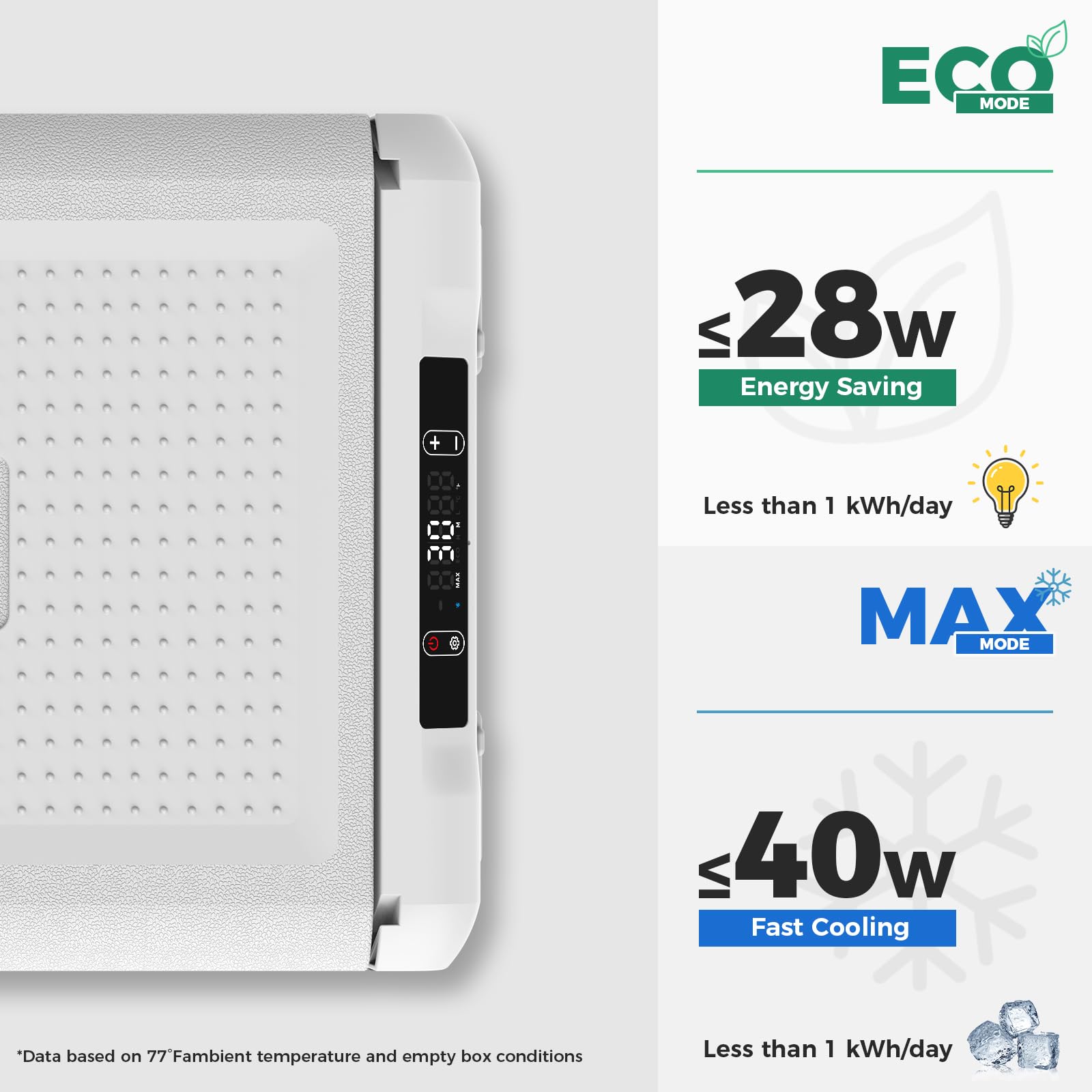 Save Energy and Money: With the Smartele refrigeration technology, this 12v coolers for vehicles can quickly cool from 68℉ to 32℉ in 15 mins and 45 min from 68℉ to -4℉.To choose ECO or Max mode that you need,this portable electric cooler consumes only 28W in ECO mode and 40W in MAX mode— less than 1 kWh a day