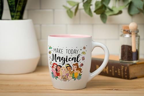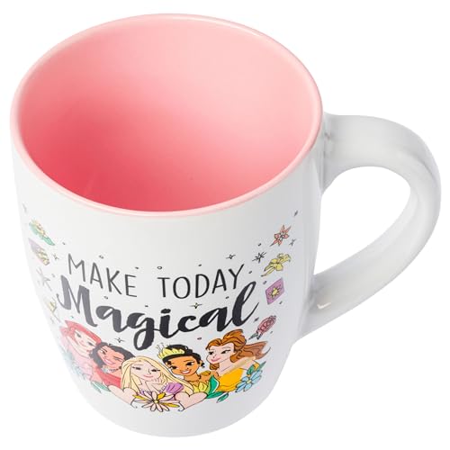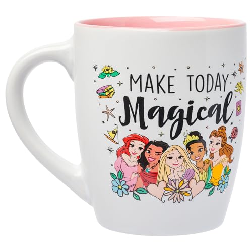 OVERSIZED COFFEE MUG: Enjoy a nice cup of coffee or tea in this pretty Disney Princess 25oz. Featuring your favorite Disney characters Ariel, Moana, Rapunzel, Tiana, and Belle under the words "Make Today Magical" against a white background with various Disney Princess icons. The inside of this mug is light pink