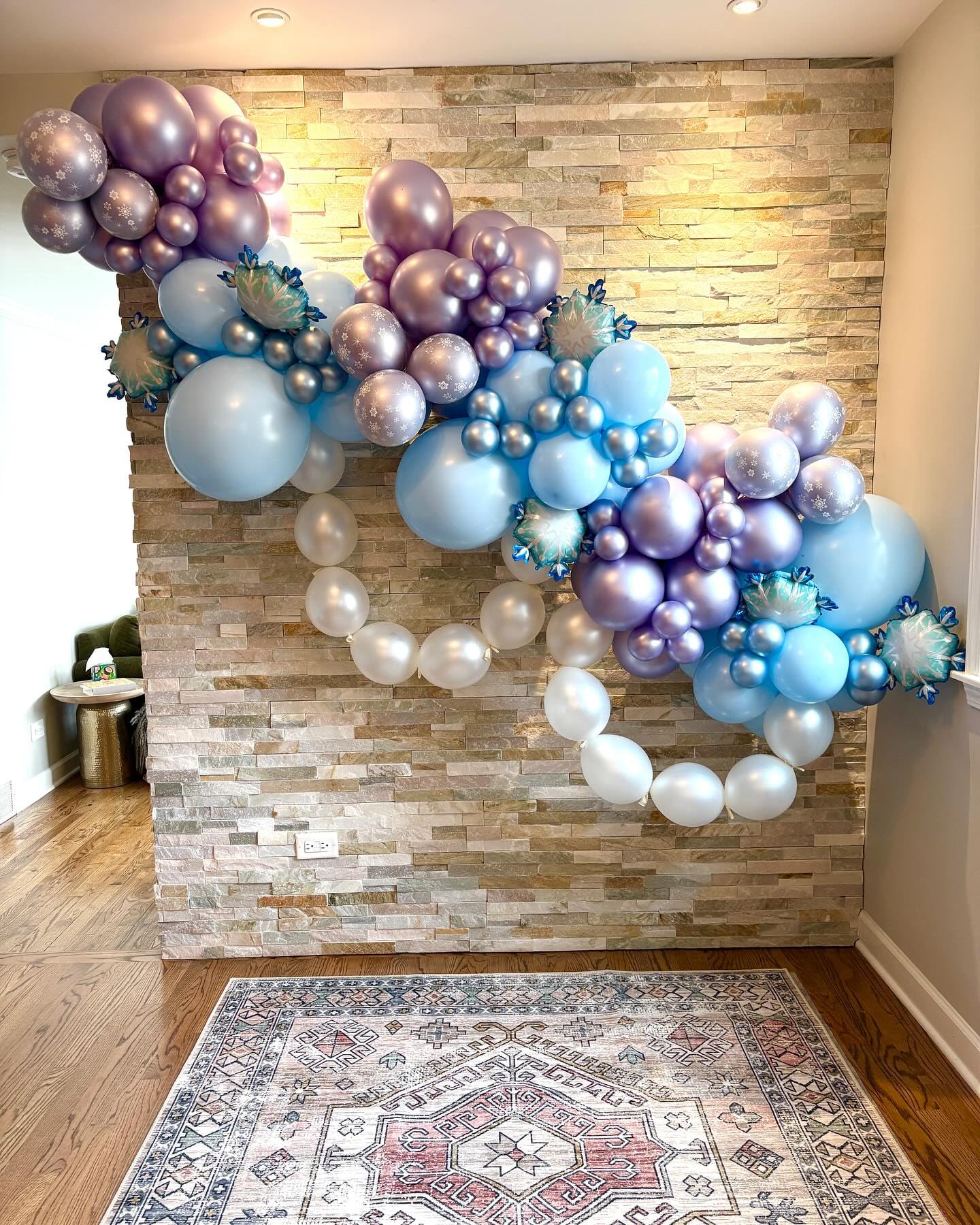 【DIY Balloons Package List】: The blue purple balloon garland kit come with 124pcs blue purple silver snowflake confetti balloons, including 4 different sizes: pearl white balloons x 20pcs, pearl blue / pearl purple balloons x 15pcs, light purple / light blue balloons x 22pcs, metallic silver balloons x 15pcs, metallic purple / metallic blue balloons x 5pcs, Snowflake confetti balloons x 5pcs, Balloon garland strip x 1 roll (16 feet) and 100pcs balloon glue dots,You can DIY your frozen party decorations according to your need.