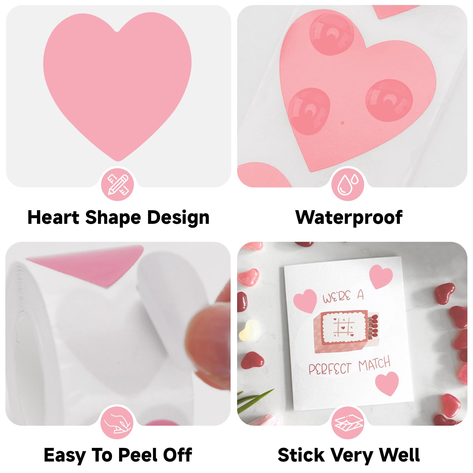[EASY TO USE]- Heart stickers roll are easy to use, they are easy to peel off the paper and stick them directly to anywhere you want. Pink heart stickers 1inch stick very well