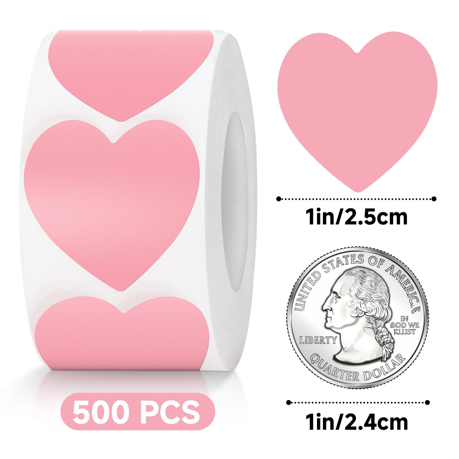 [WHAT YOU GET]- 1 roll of 500pcs heart shape stickers, the size is 1inch/2.5cm. The quantity of Valentine's day heart stickers is sufficient and the quality is excellent, enough to satisfy your needs for a long time