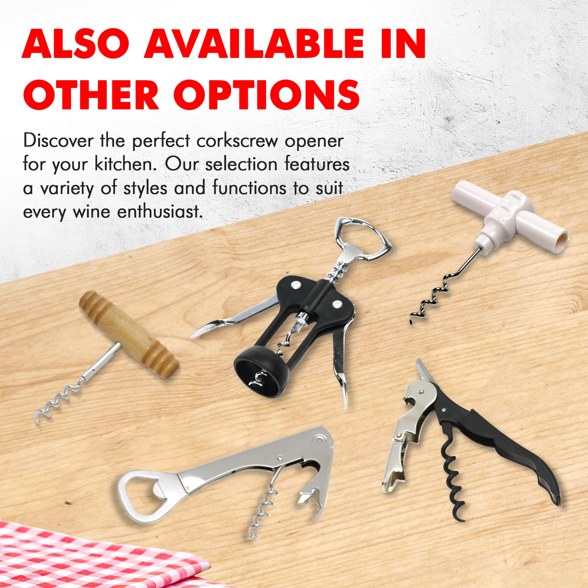 This 5-inch waiters corkscrew with a nonstick coating is a classic corkscrew design that has a foil cutter blade, a two stage cork lifter and bottle opener. Open a wine bottle by twisting in the screw, placing the openers shortest step on the top of the bottle lip and pivoting up the handle. After raising the cork partially, lower the handle to engage the longest opener step on the bottle lip then pivot on the handle to remove the cork from the bottle.