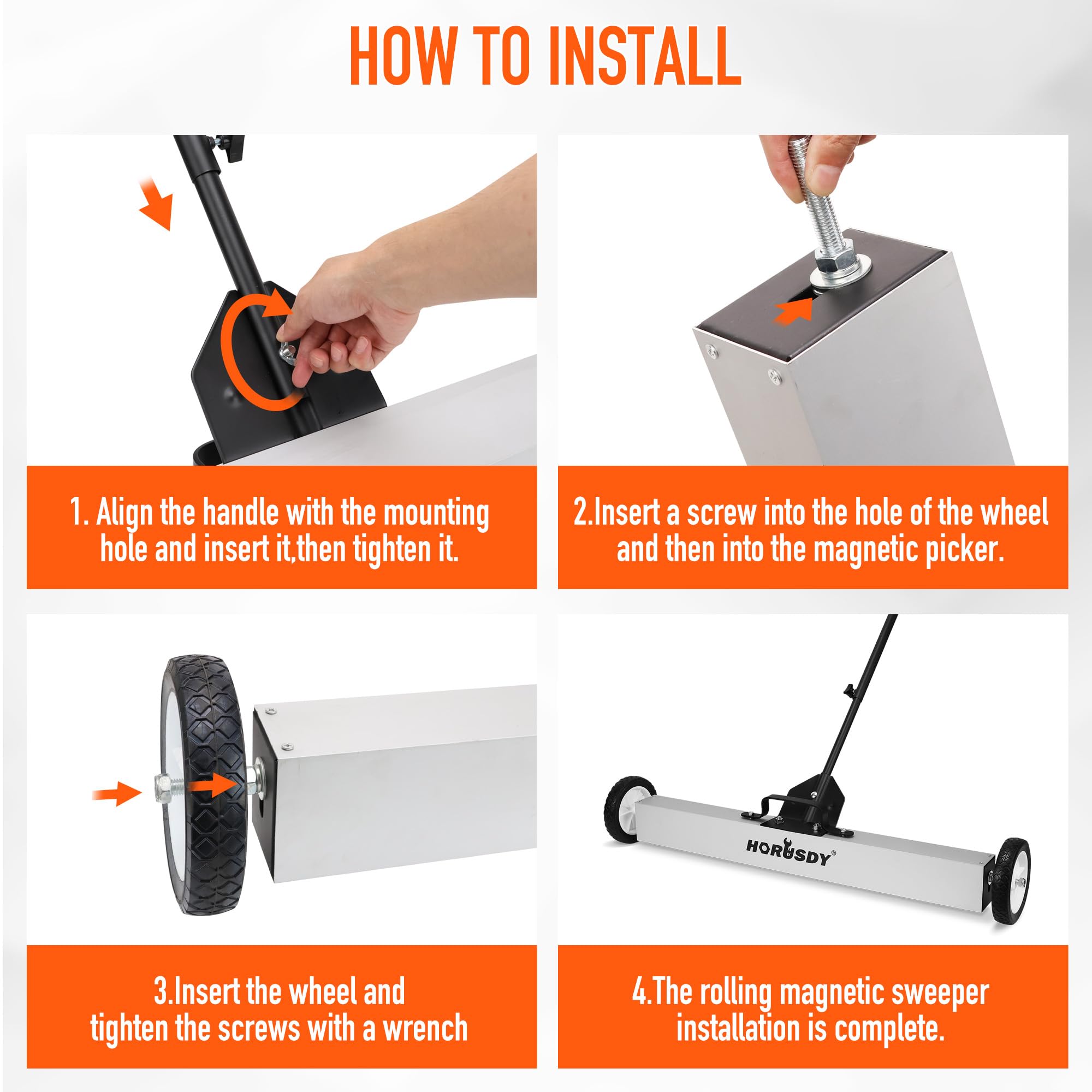 3-inch wheels with rubber pedals: Side mounted wheels with steel lining and rubber pedals can be operated indoors or outdoors. Just push and pull this rolling magnet sweeping cart like a carpet sweeping cart, or push the broom on different terrains.