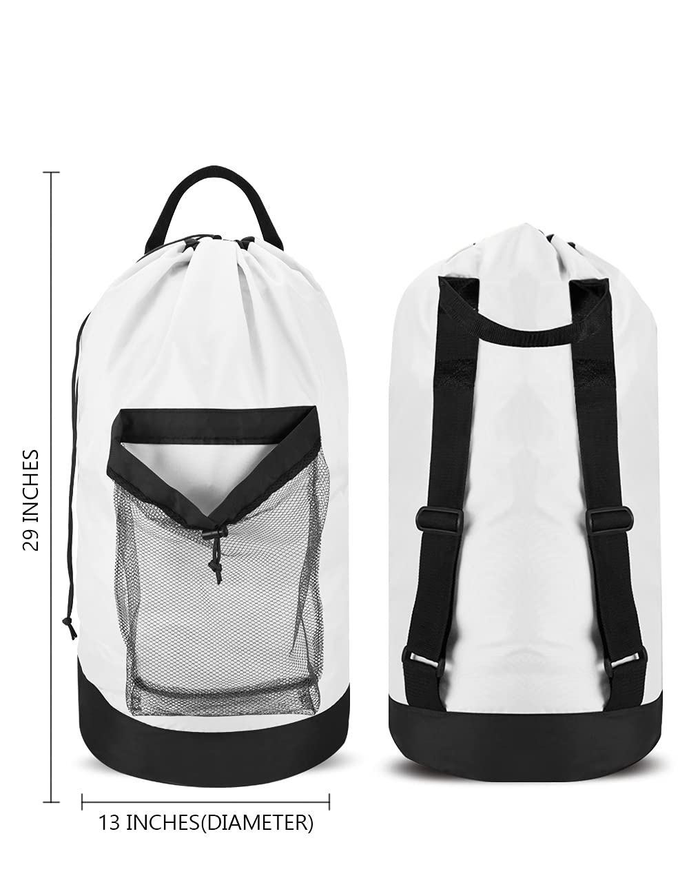 LAUNDRY CAPACITY - Measures 13"(diameter) x 29", this size is big enough for holding 2-3 loads of laundry. Perfect capacity for laundromat use or family use. Note: Tight a knot over the drawstring cord lock to ensure nothing lost when the laundry bag is full.