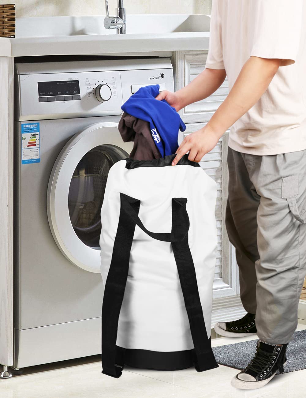 USE AS HANGING HAMPER - Hang this laundry backpack on the wall or door as hanging laundry hamper with the reinforced hanging loop on the bag to collect dirty laundry. Suitable for college, camping and home.