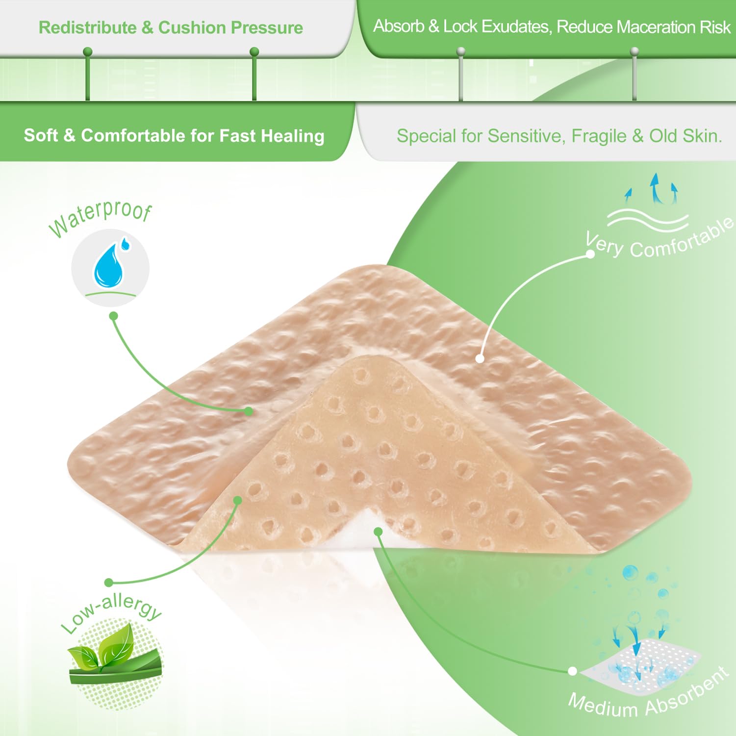 ✅ Soft, comfortable & medium absorbent, absorb & lock wound exudates, reduce skin maceration risk, provide cushion and redistribute pressure.