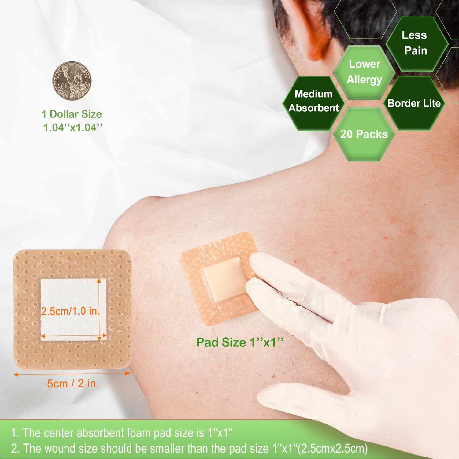 ✅ Individual package, dressing size is 2x2 inch, absorbent pad size is 1x1 inch, 20 packs each box. Not made with natural rubber latex. Relieve pain and suffering, enable to move easily, add comfort and enhanced healing.