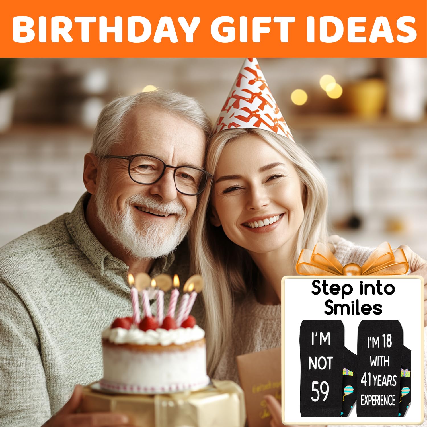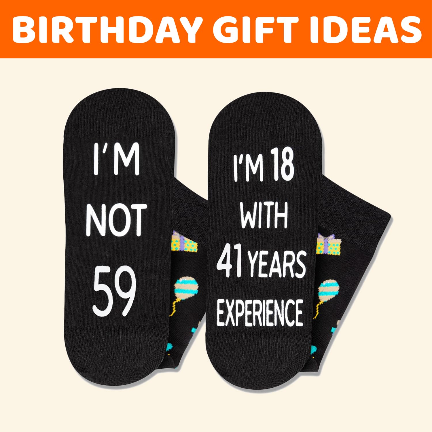 59 BIRTHDAY GIFT IDEAS: "I'M NOT 59, I'M 18 WITH 41 YEARS EXPERIENCE." These birthday socks feature a funny saying that reads These are suitable for any holiday gifts, like Birthday gifts, Christmas gifts, or White Elephant gifts.