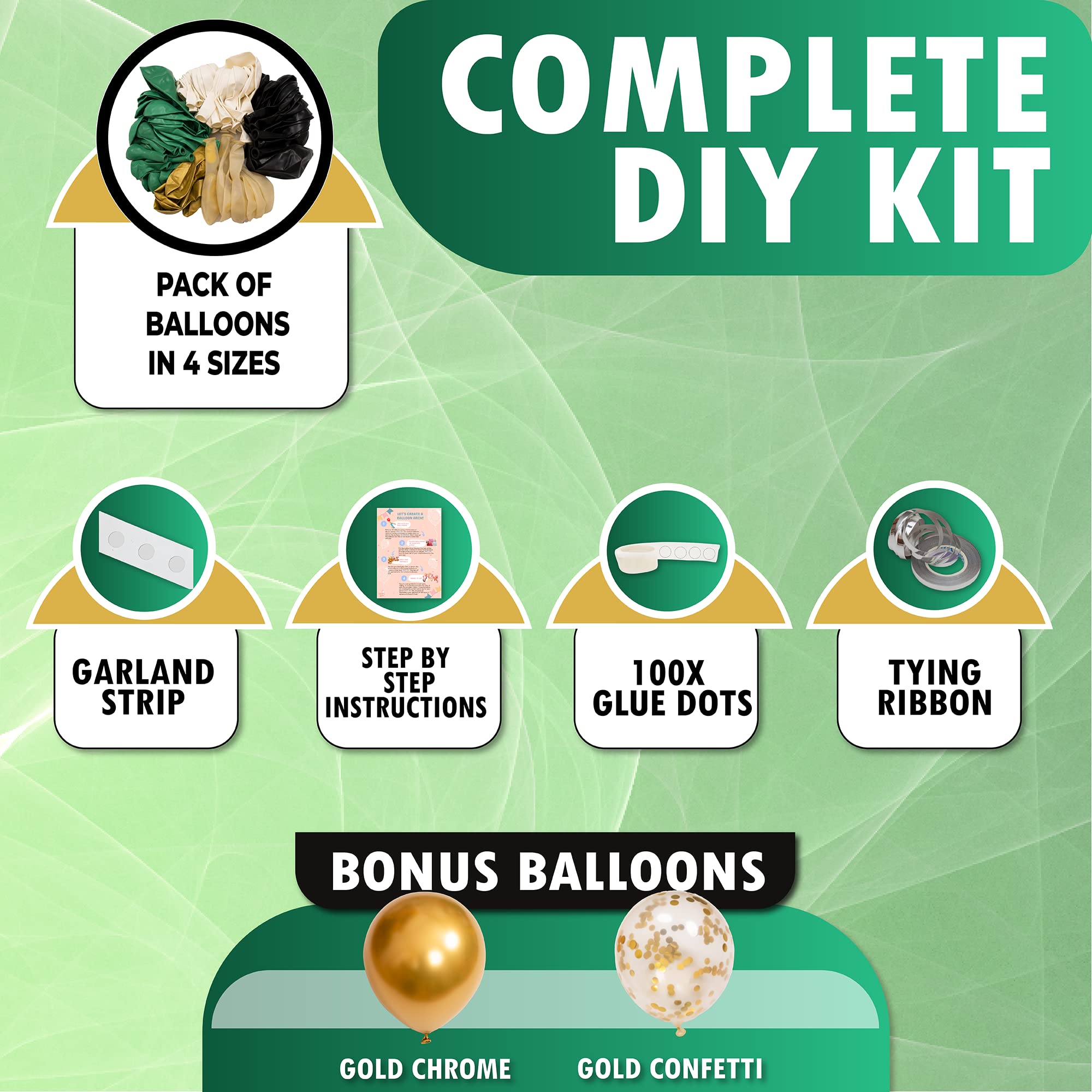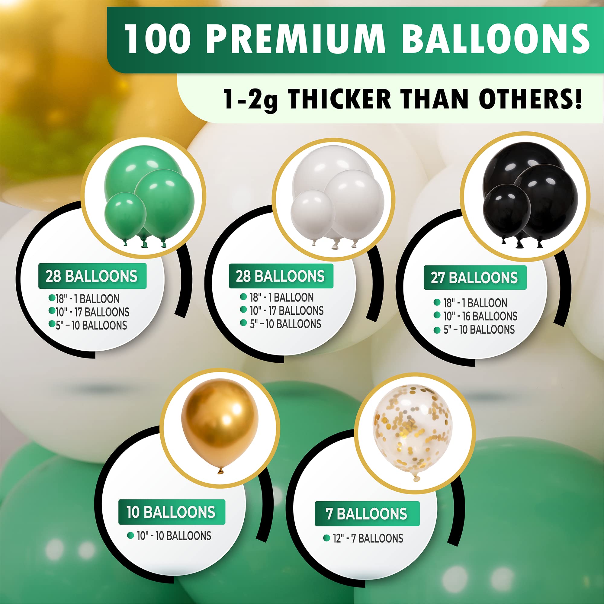 Balloon Sizes and Colors: Includes small, medium, and large balloons in green, black, white, and gold.