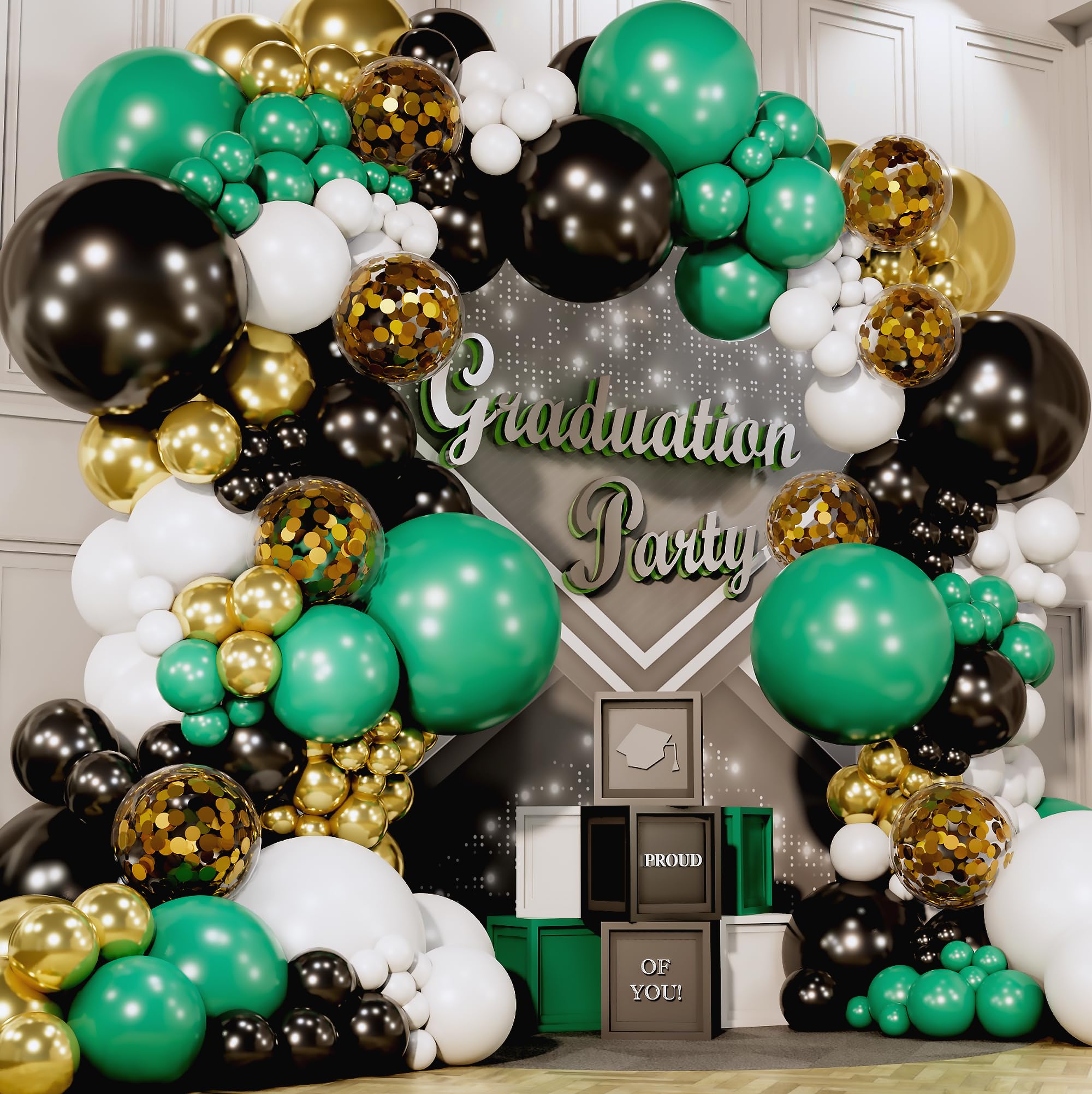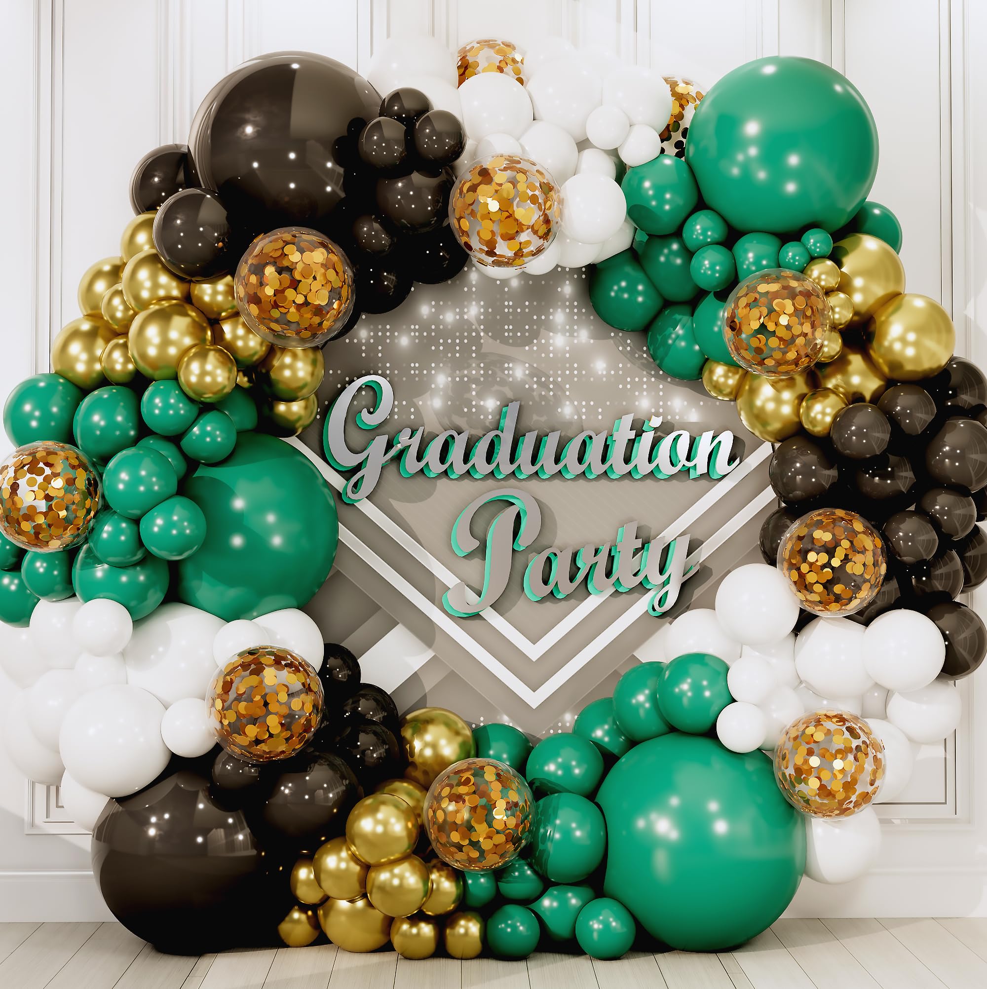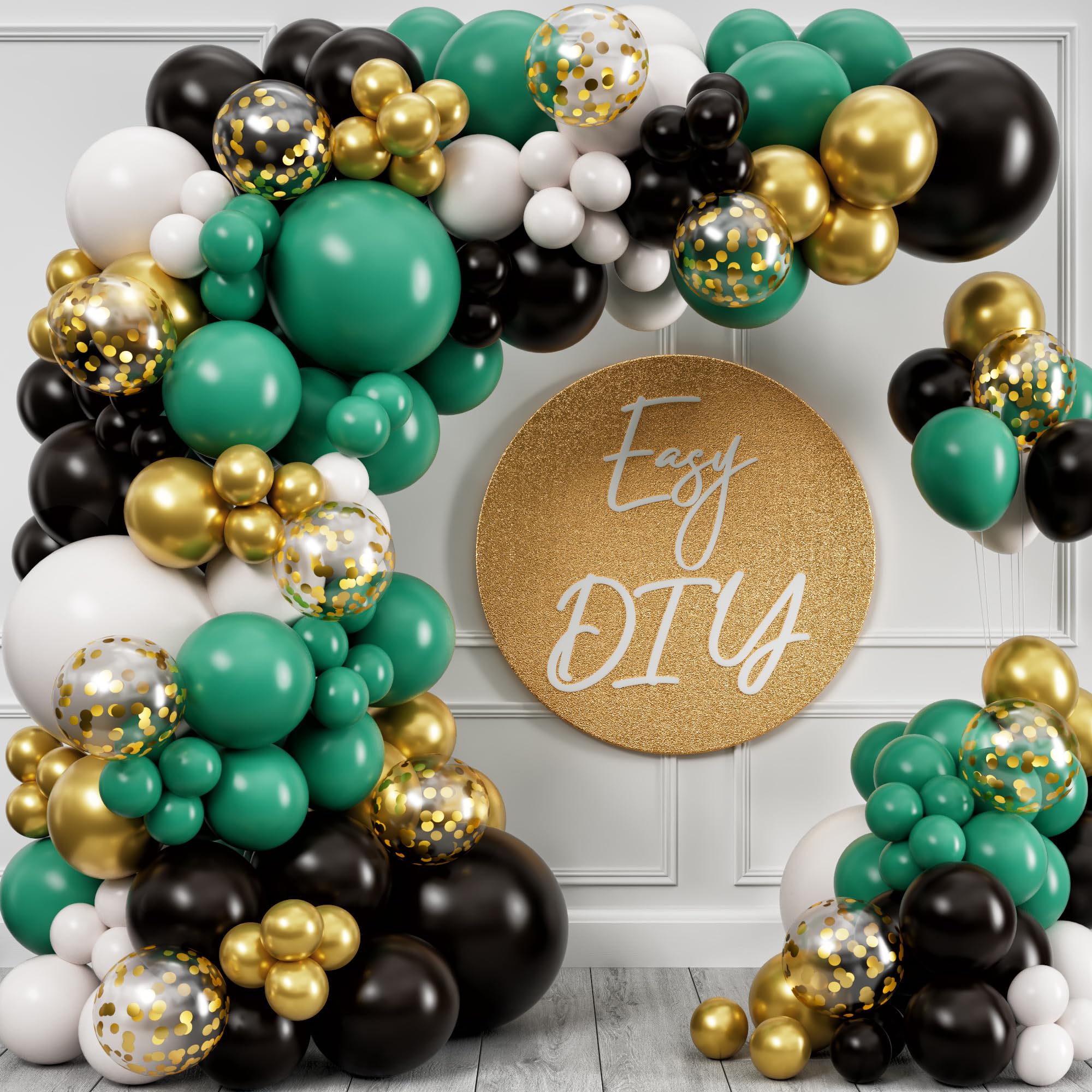 Easy DIY Balloon Garland Kit: Contains 100 white, green, black, gold balloons and accessories for quick and simple assembly.