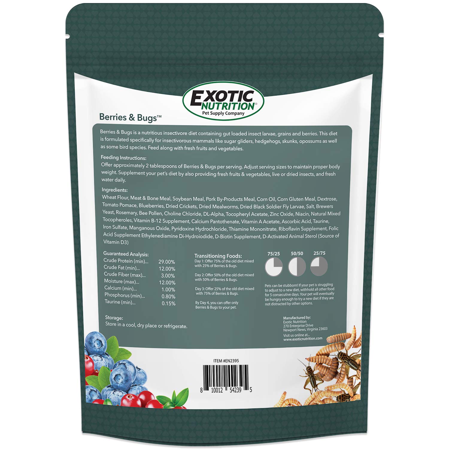 Exotic Nutrition's Berries & Bugs is a nutritious insectivore diet containing gut loaded insect larva, grains and berries. NET WEIGHT: 1.5 lbs. FEATURES: ✔ TAILORED - formulated specifically for insectivorous mammals like sugar gliders, hedgehogs, skunks, opossums as well as some bird species. ✔ 100% NATURAL - no artificial colors, flavors, or preservatives ✔ COMPLETE - Designed to be offered alone, but can be mixed with other foods, insects, fresh fruit, etc. ✔ EASY - Heavy-duty, resealable bag to keep in freshness ✔ QUALITY - Made in the USA ✔ LONG SHELF LIFE - Refrigerates up to 6 months, freezes up to 12 months GUARANTEED ANALYSIS: Crude Protein (min) 29.0%, Crude Fat (min) 12.0%, Crude Fiber (max) 3.0%, Moisture (max) 12%, Calcium (min.) 1.0%, Phosphorus (min.) 0.80% FEEDING INSTRUCTIONS: Offer approximately 2 tablespoons of Berries & Bugs to your pet daily. Adjust the amount to ensure your pet's optimum body weight (free choice for pregnant or lactating females). Provide a high-protein pellet, live or dried insects, and fresh fruits for additional nutrients to vary the diet. Do not leave dry food in cage for more than 24 hours. Always provide fresh drinking water. STORAGE INSTRUCTIONS: Refrigeration is highly recommended to retain full nutritional value. Store bag in a cool, dry place (under 72 degrees). Keep food in a sealed, airtight container. We recommend storing the bag of food in the refrigerator, taking out enough food for a week at a time, and then refilling with the refrigerated food. Do not frequently expose food to a freeze/thaw cycle. If storing bag for longer than 8 weeks, refrigerate (up to 6 months). If storing for longer than 6 months, freeze (up to 12 months).
