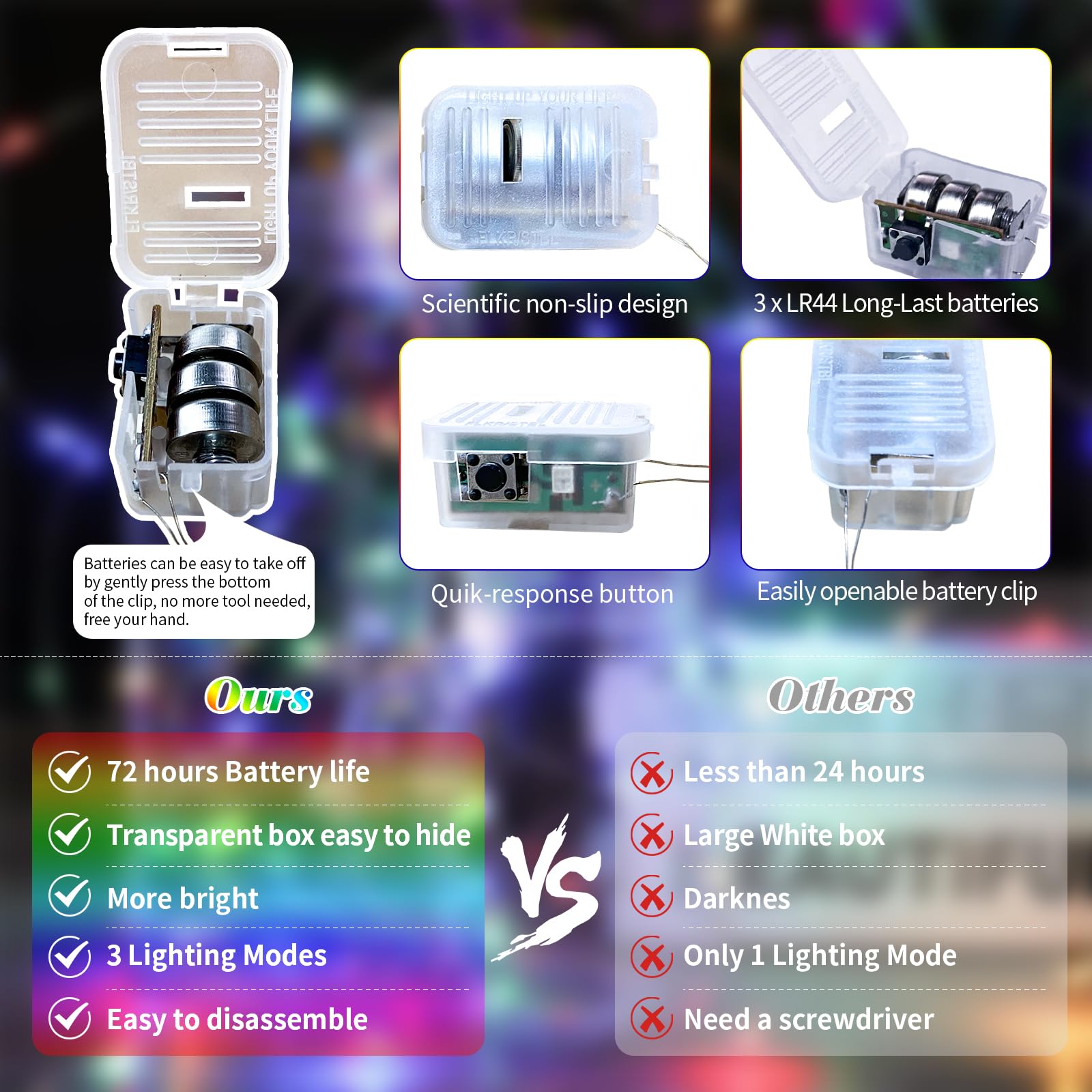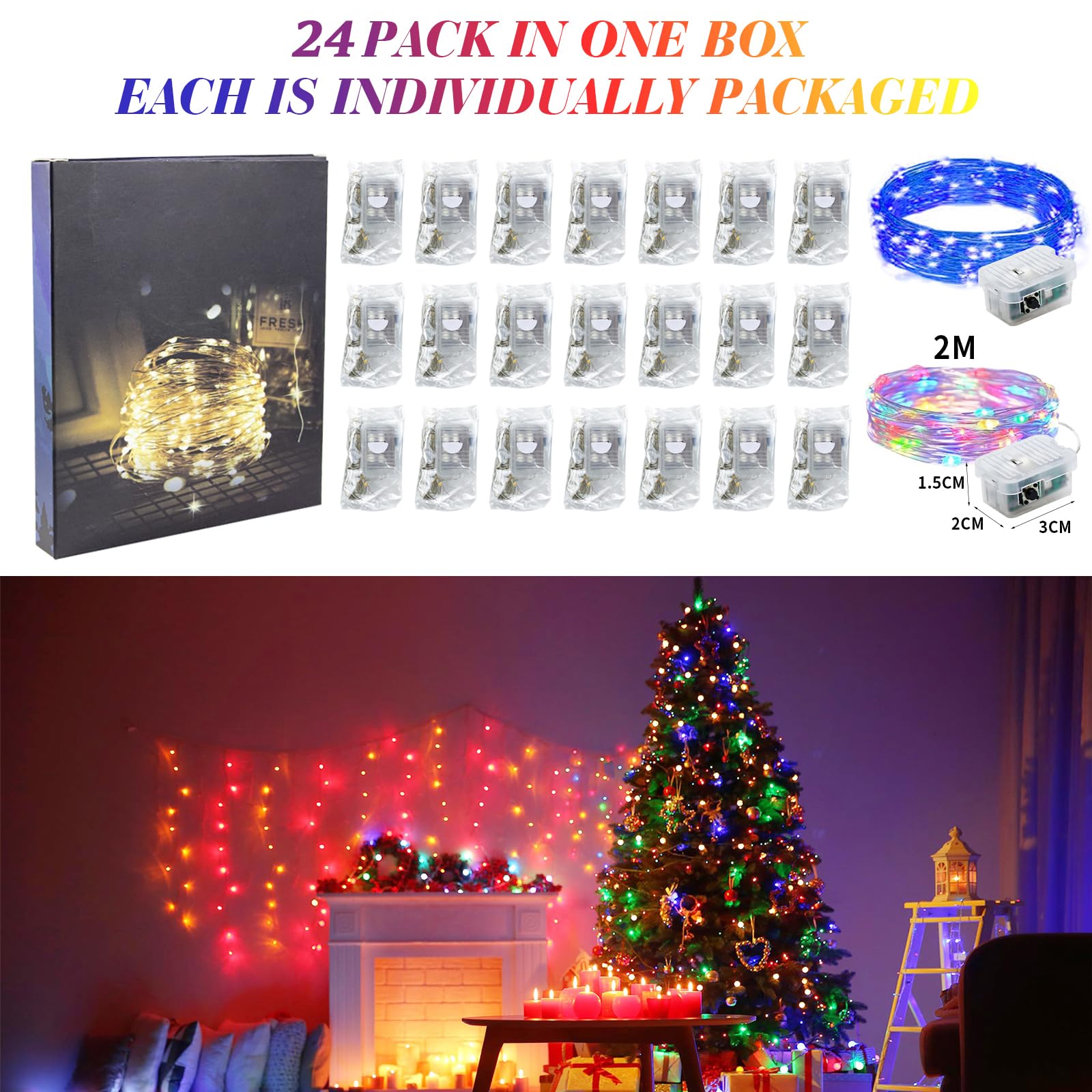 PREMIUM QUALITY AND LONG LAST LIFE: 12 pack in a box, each twinkle lights made of high quality durable 7 feet long flexible silver wire, and 20 energy-efficient mini led fairy lights, 4 inch distance between each led moon lights. This fairy lights battery operated by 3 x LR44 batteries (included), which can provide 107 hours life. This Christmas lights is perfect for both everyday decorations as well as holiday decor (Batteries need to be replaced when the string get dims)
