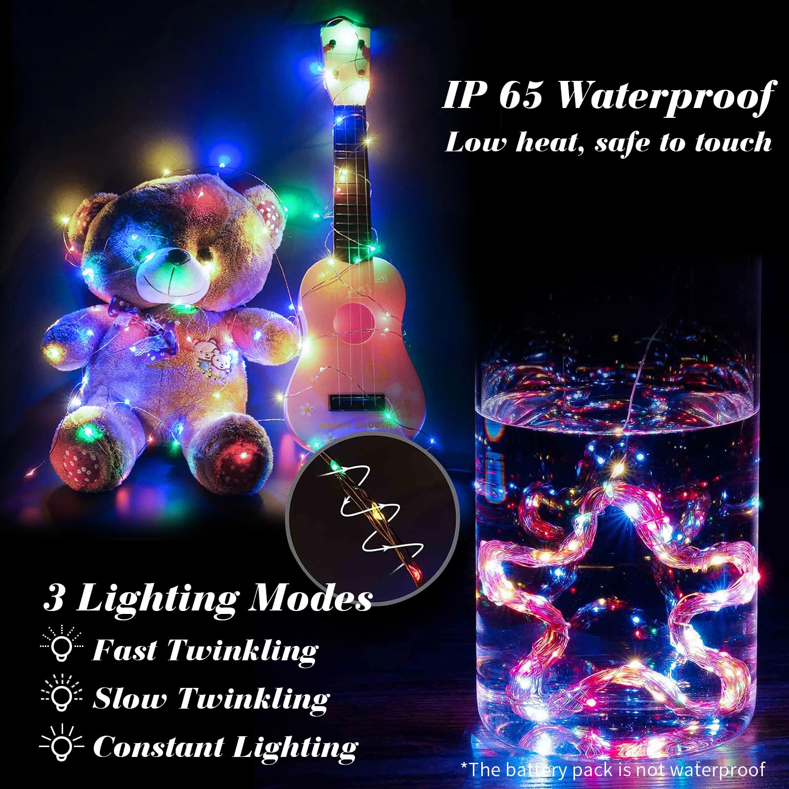 IP65 WATERPROOF AND INDIVIDUALLY WRAP: The battery fairy lights are waterproof can be used for Indoor/Outdoor. (the battery pack is not waterproof) safe to the touch. Made of soft bendable wire so you can easily bend into any shape or wrapped it on anything such as Christmas trees, wine bottle, pumpkins, guirlande lumineuse interieure, potted landscape etc.Each light is individually packaged, say goodbye to cable tangles and bring more happiness and satisfaction to your family and friends
