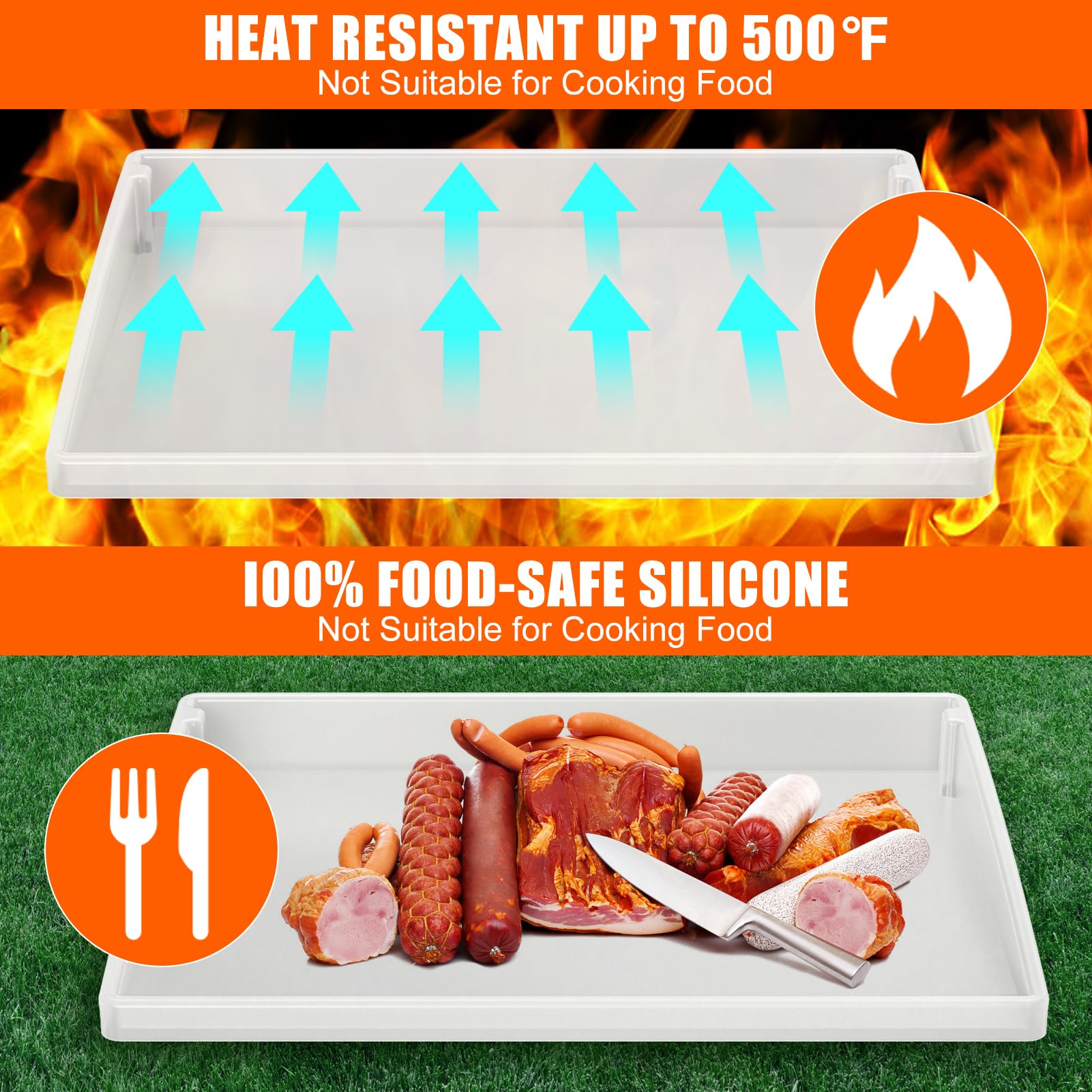 【FOOD GRADE SILICONE】: The griddle mat for blackstone grill is made of 100% high-quality food-grade silicone, thick, durable, soft, safe and reliable, you can use it with confidence, it will not heat or transfer heat, and can withstand up to 500℉.