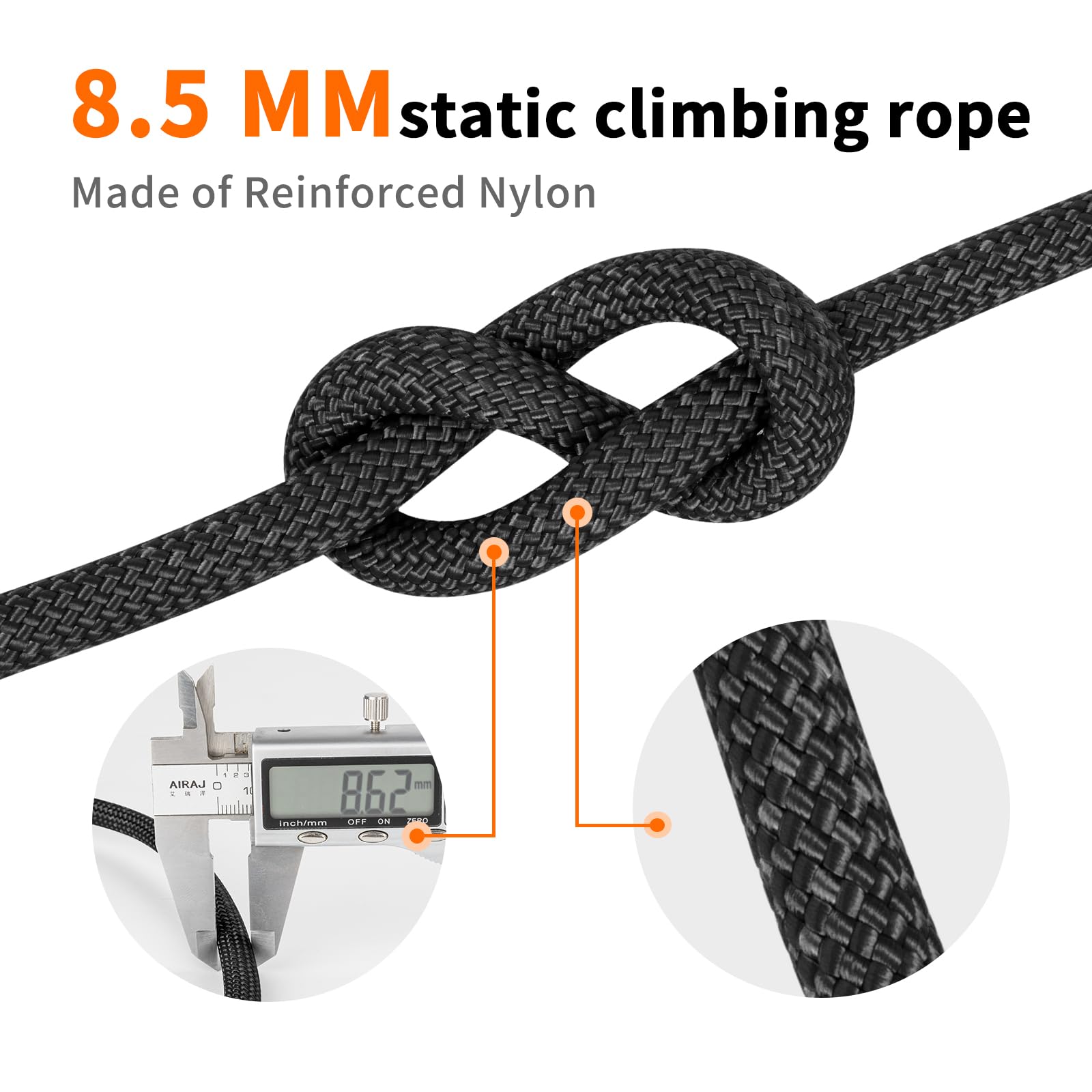 Details: Package includes 8.5MM static climbing rope *1, storage bag *1. Heat cut sealing process on rope ends, you can cut the rope at will without worrying about the rope unraveling. Bright color ensure great visibility in all weather. Available in sizes from 32FT to 230FT.