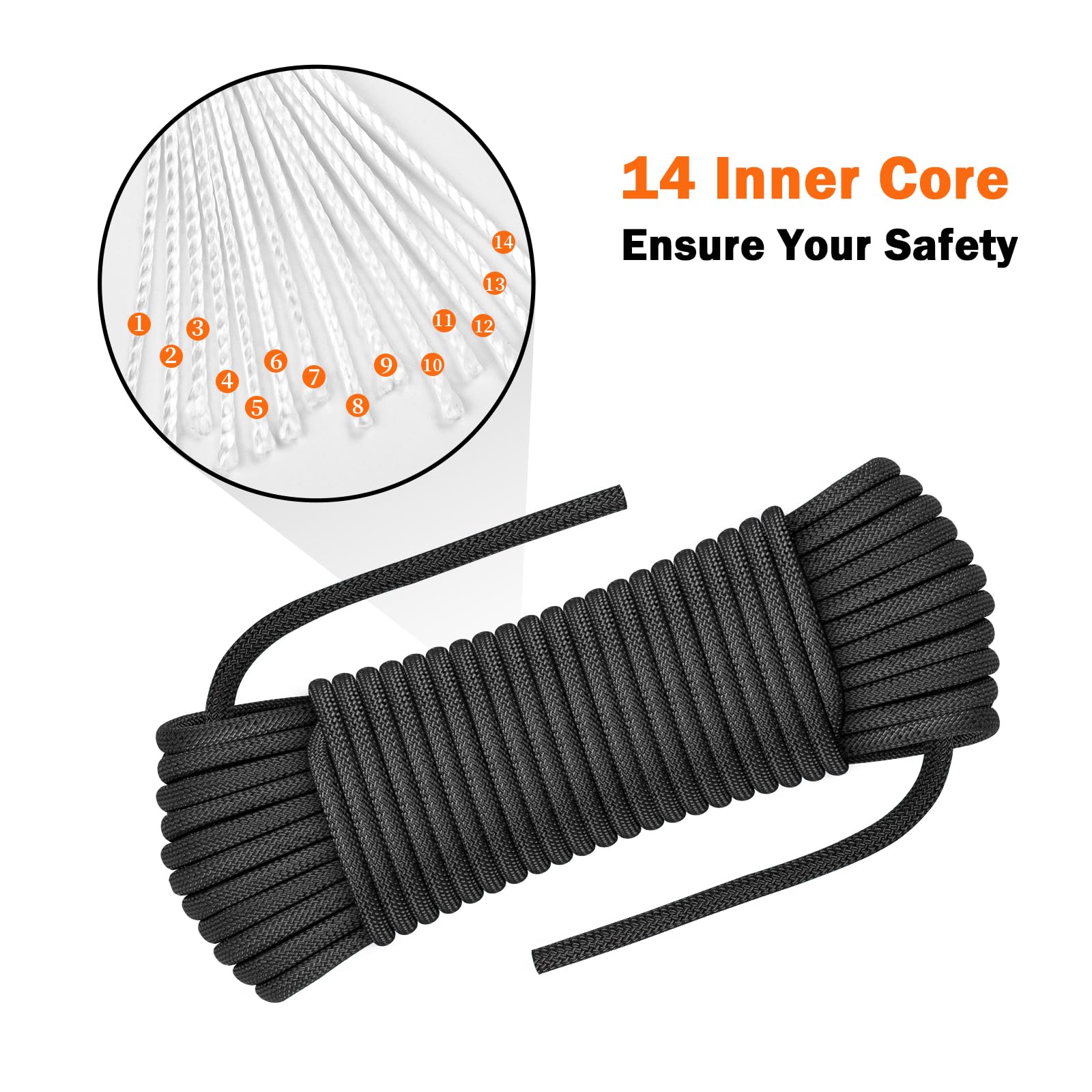 Ultra Strong Static Rope: Features a 48-thread reinforced polyester sheath surrounding 14 solid inner cores. Precision digital machine weaving keeps sheath slippage rate about 1.24% - the best practice knot hardness and climbing experience, can pass through most belay devices.