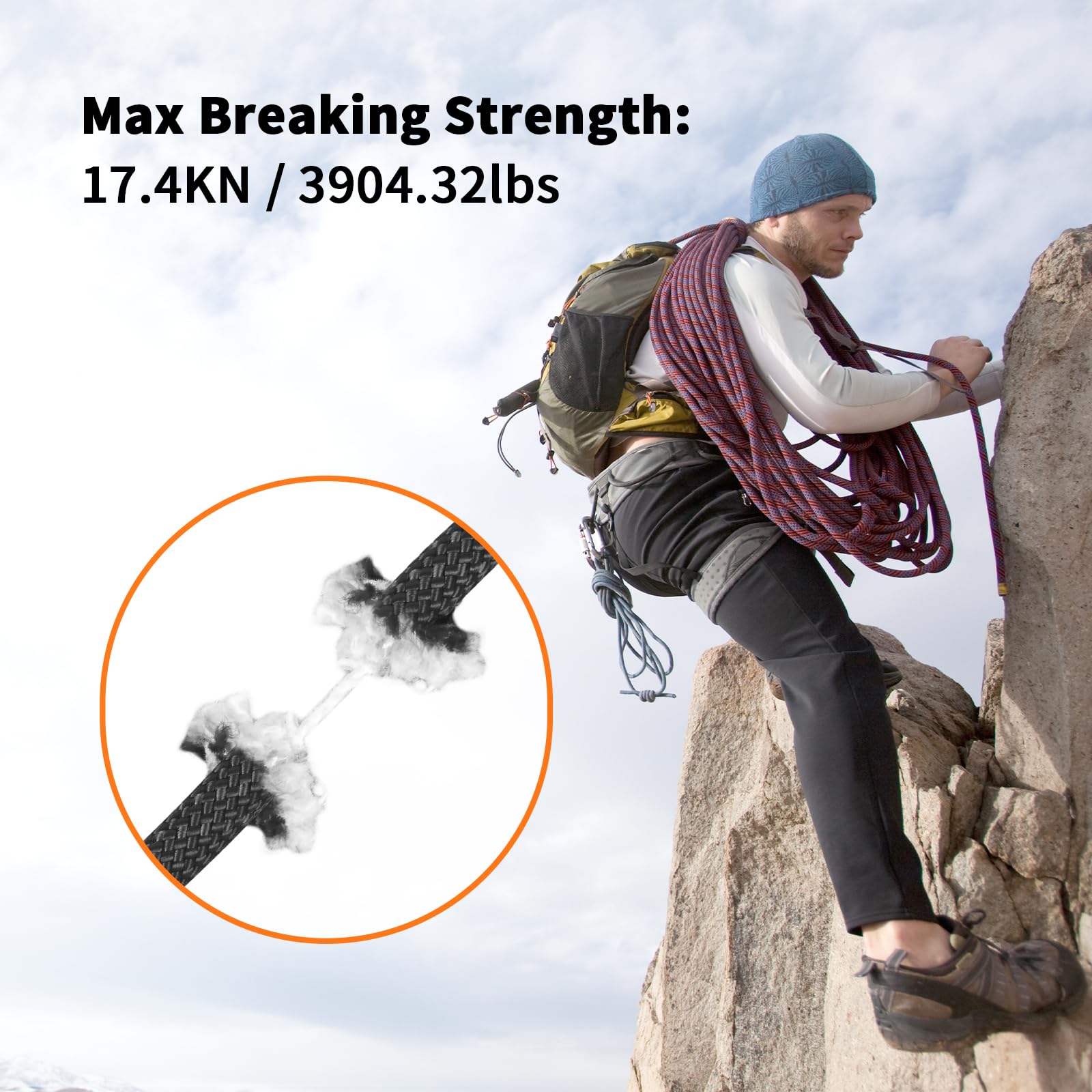 Professional Grade: Maximum tensile strength of 17.4 KN (3904.32lbs), weight limit of 300 kg, static elongation less than 1%. Low ductility rock climbing rope can reduce the safety risks caused by the extension of the rope, ensure your safety when doing any outdoor activities.