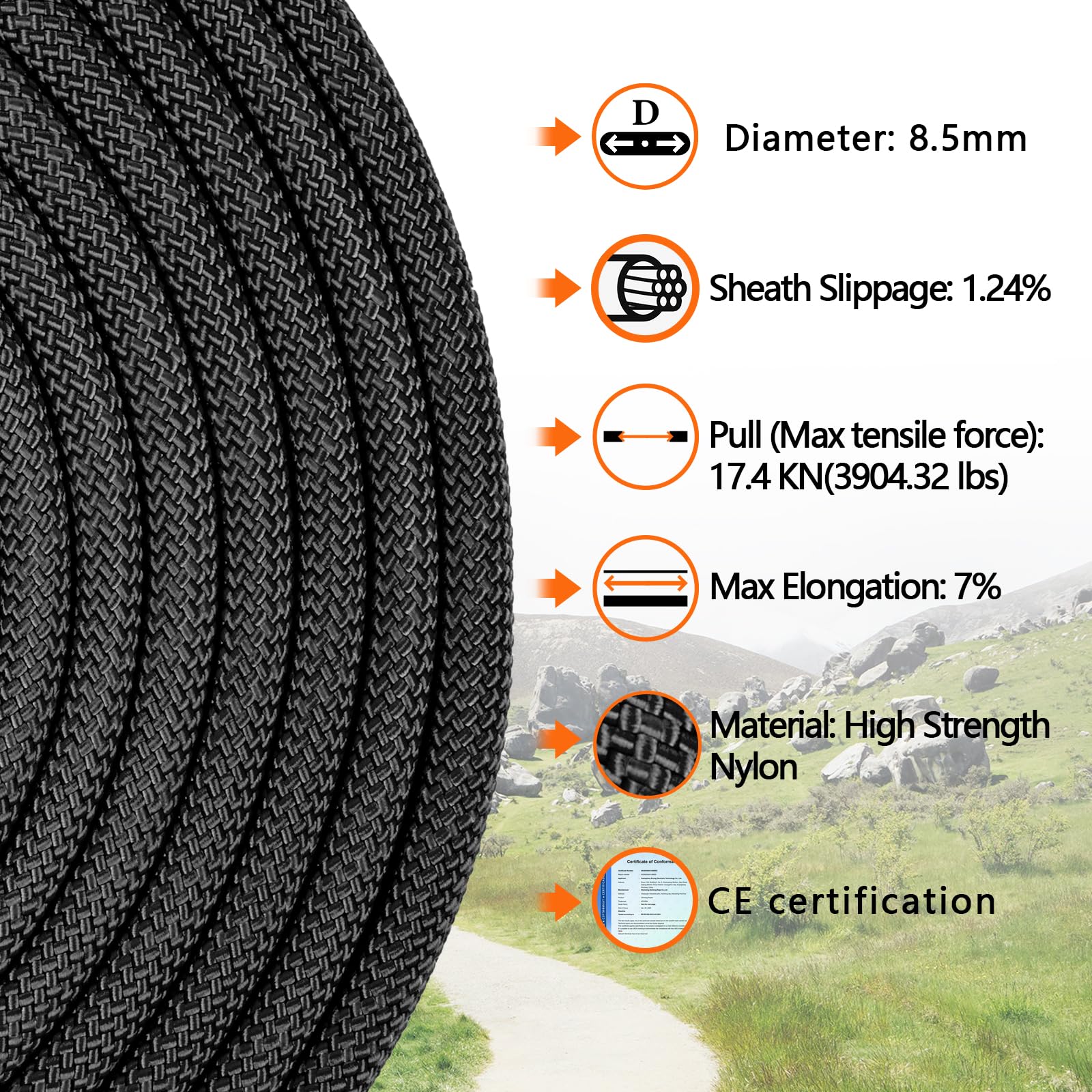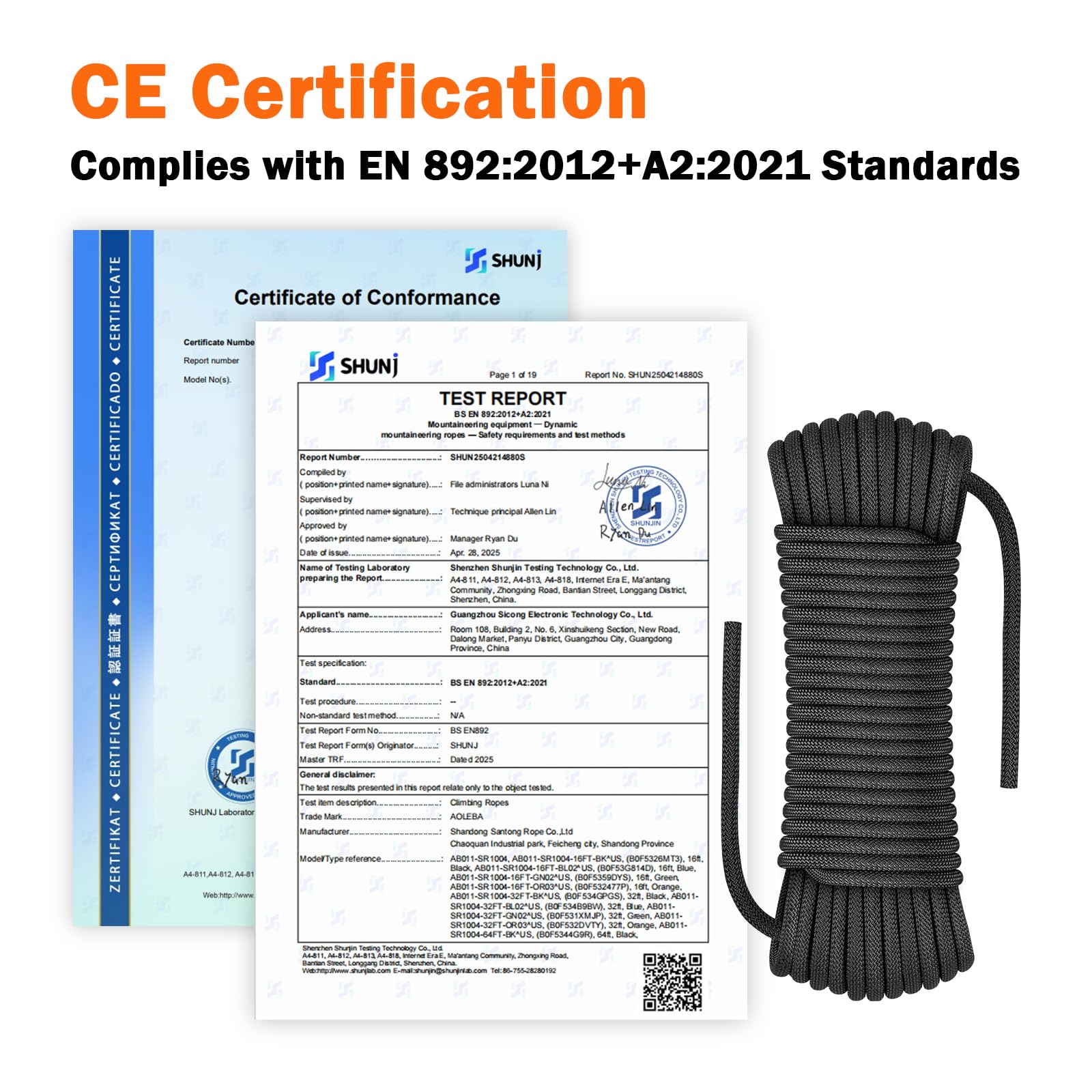 CE Certified: Our static climbing rope meets the CE Certification of EN 892:2012+A2:2021 Standards (Certificate No. : SHUN2504214880SC), ensuring quality control. UV-Resistant & Abrasion-Proof give the rope a longer service life.