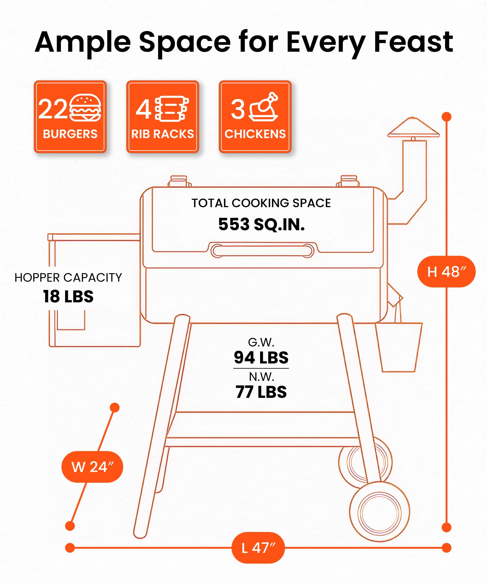 Ample 553 SQ IN Capacity: Generous 553 square inches of grilling space accommodates large meals for family gatherings or entertaining. Cook for a crowd with ease on this versatile pellet grill.