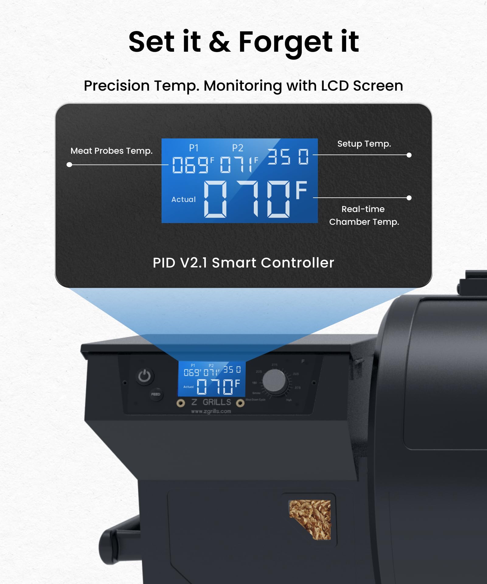 PID 2.1 Precision Control: Features an advanced PID 2.1 controller with LCD screen for superior temperature accuracy and consistency. Auto-tunes fuel and airflow, maintaining perfect heat even with external temperature changes.