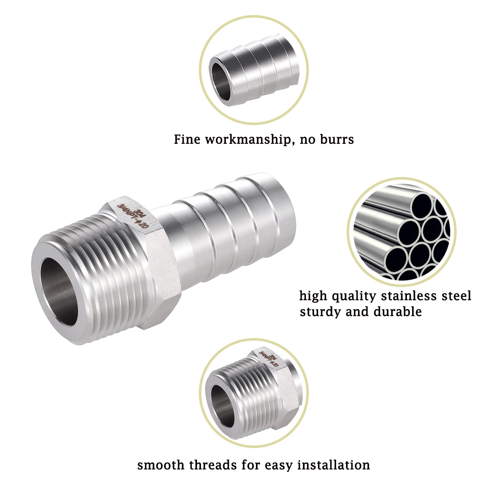 material: hose barb fittings are made of 304 stainless steel, thickened, heavy duty, sturdy construction, good corrosion resistance, more durable than plastic and galvanized fittings.
