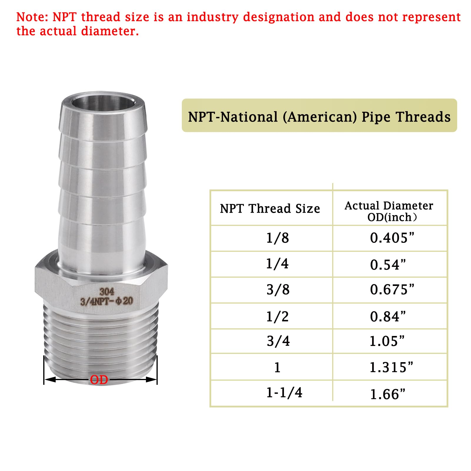 size: 3/4" barb (3/4" ID hose) x 3/4" NPT (actual thread diameter is 1.05"), dimensional chart in link, please check before purchase.