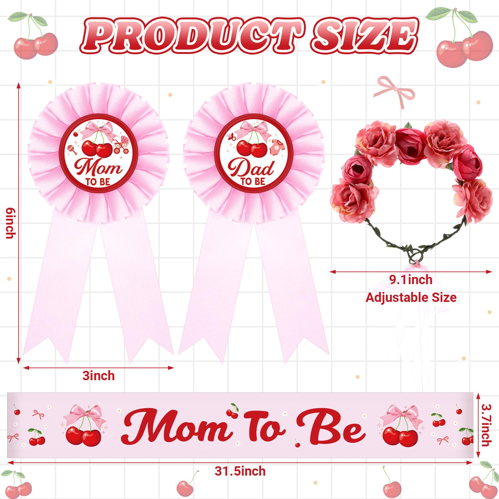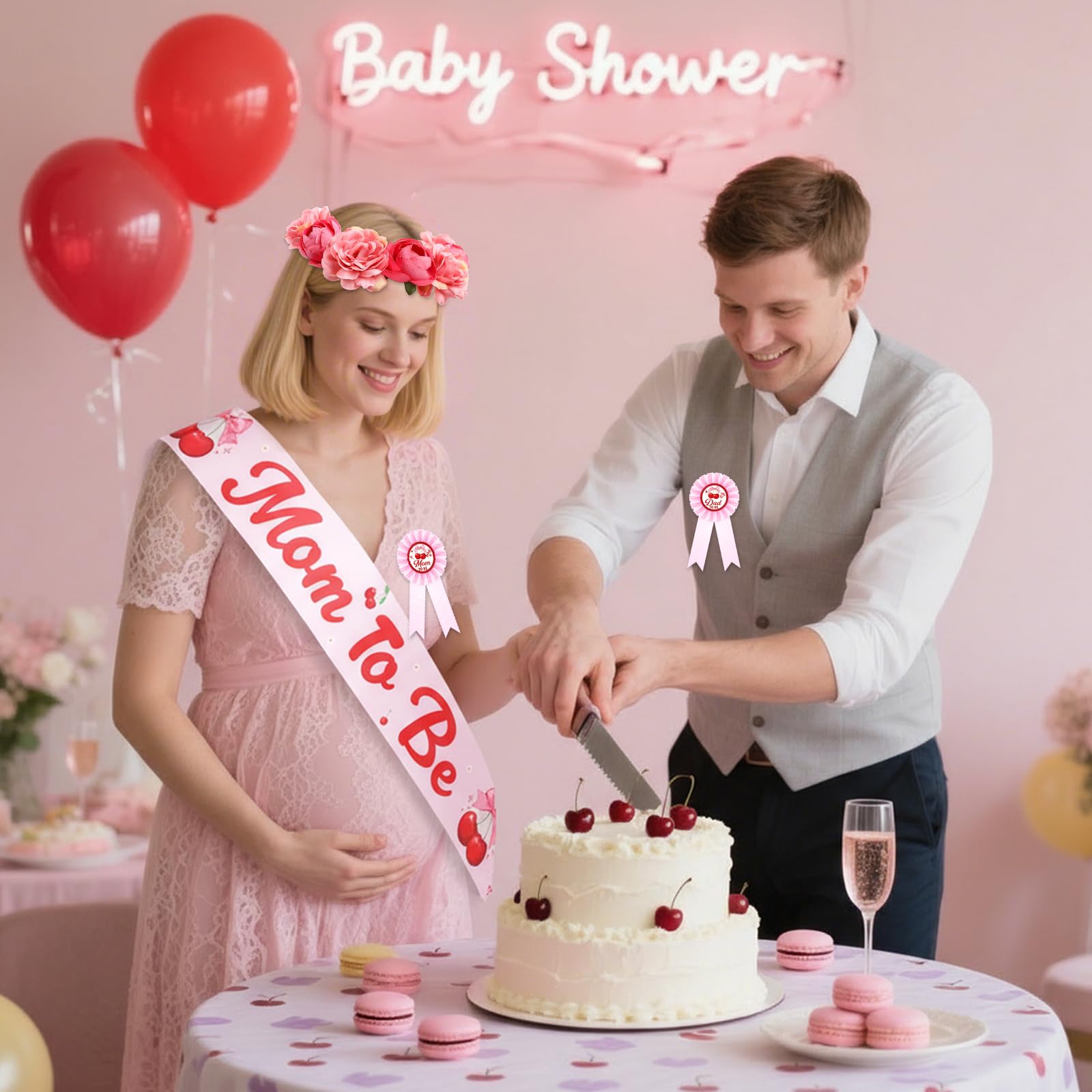 Cute Cherry Design: our baby shower sash and button pin design with sweet cute cherry in vibrant color, printed with letter [ Mom To Be], and you can use these sash, pin and crown to set up the festive mood for your gender reveal or baby shower party