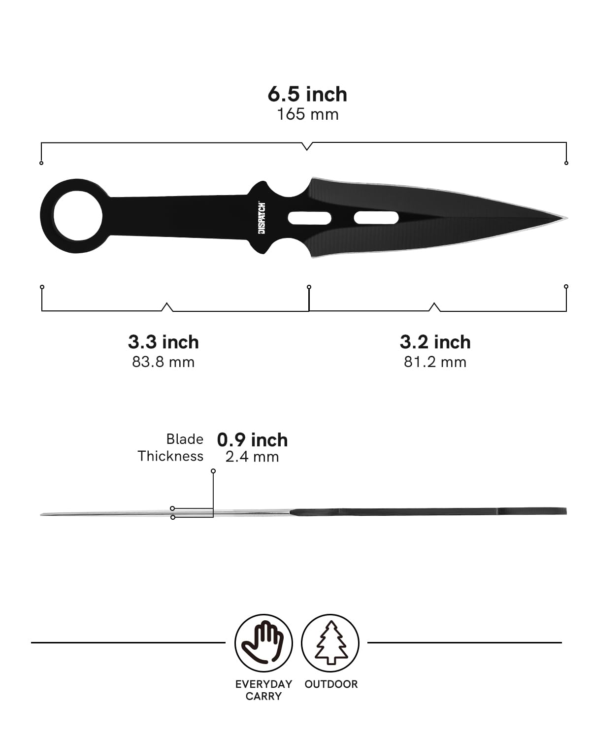 DIMENSIONS: Each knife in this kunai set measures at 6.5 inches in overall length, 1.16 oz each. 3.2-inch blade length, 0.93-inch width and 2.4mm thickness