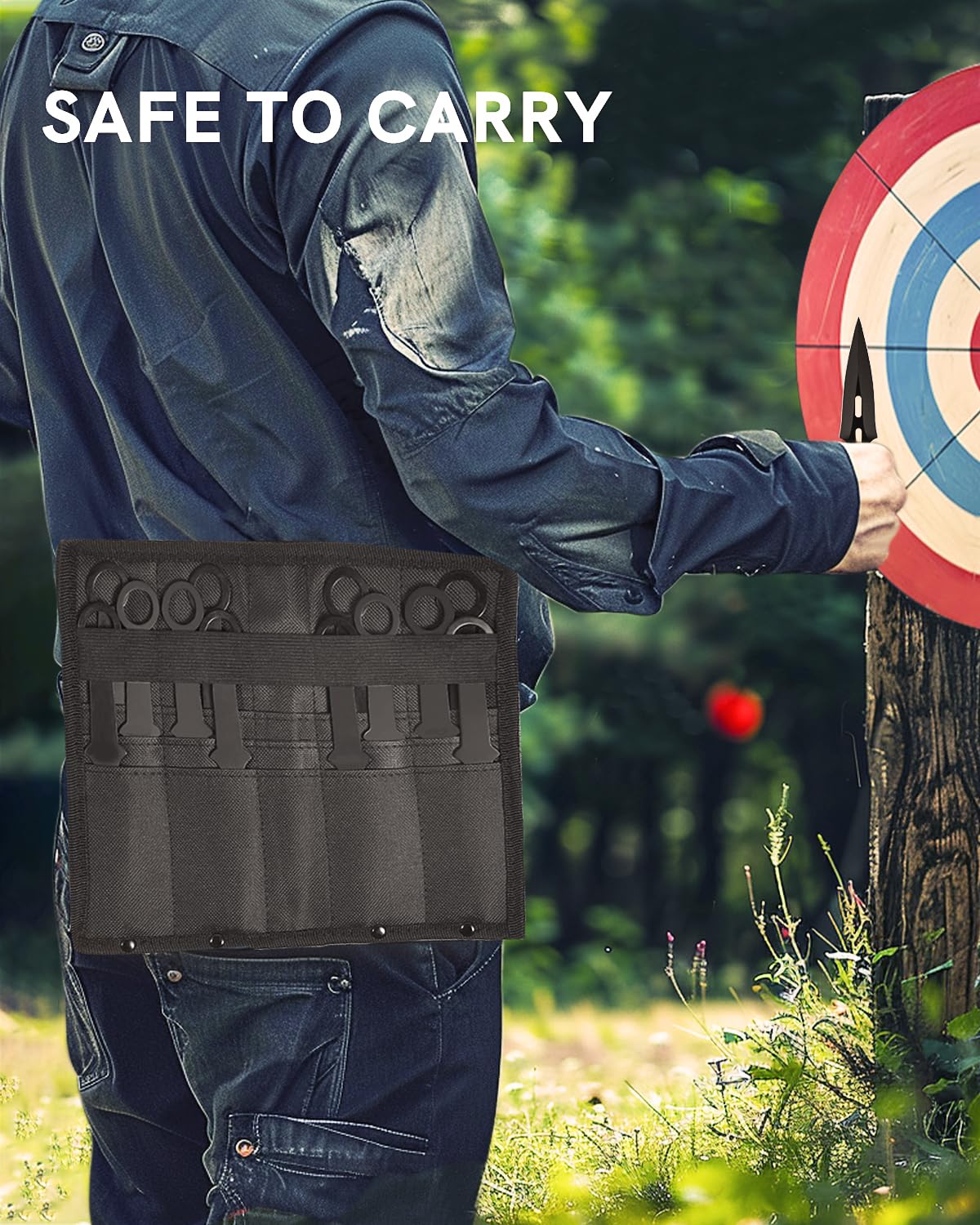EASY CARRYING AND STORAGE: Store and protect this knife throwing set inside the included nylon sheath when not in use. Slots for each knife, straps to keep them in place, and a secure hook and loop closure ensure the set stays put in transit