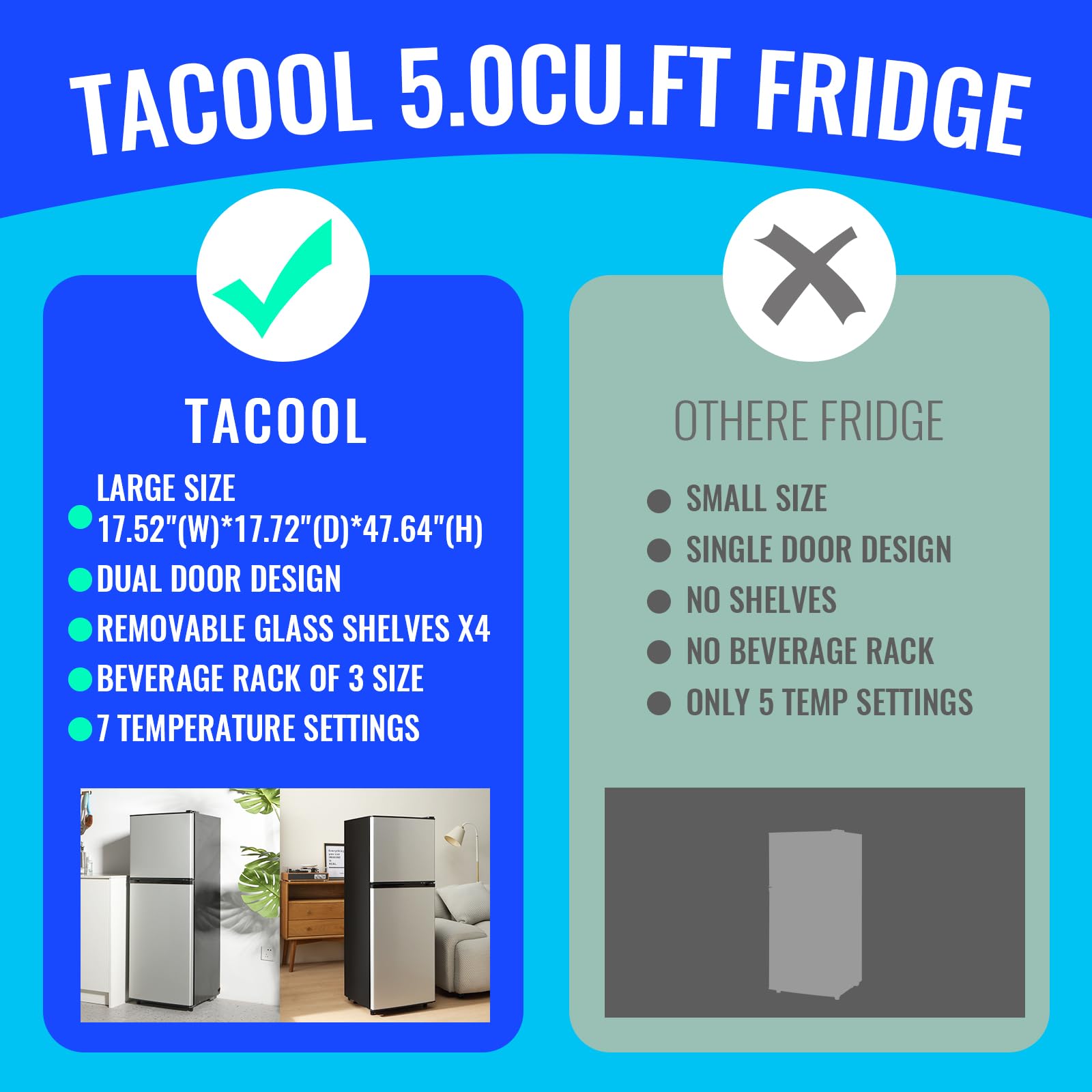 Large Store Capacity:The Small Refrigerator with top freezer measures 17.52" W x17.72" D x 47.64"H and has a large capacity of 5.0 Cu.Ft. The well-designed layout not only maximizes the utilization of space but also proves to be highly suitable for apartments, bedrooms, offices, and kitchens