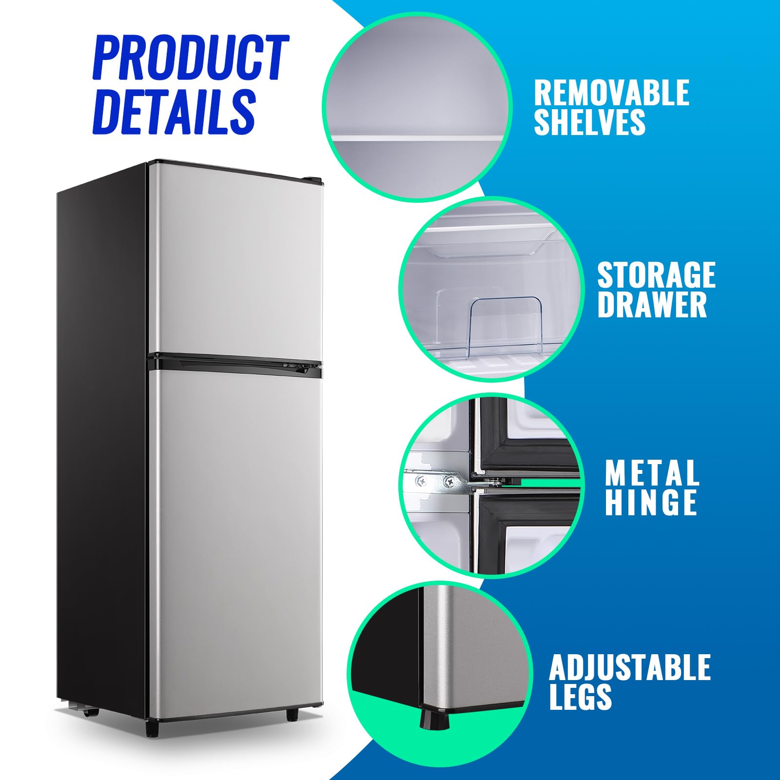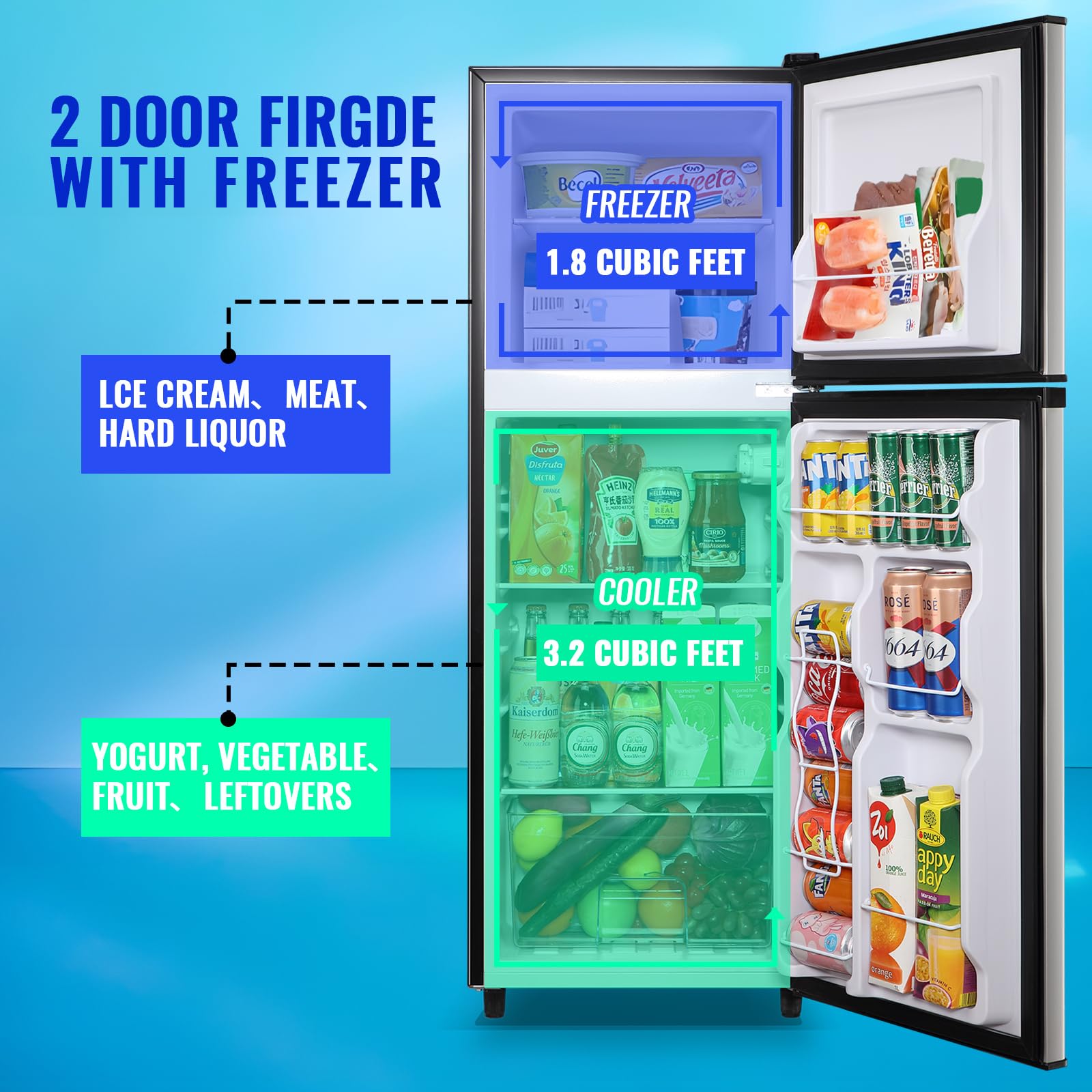 Extra Space: Refrigerator adopts double door design, independent space, avoid food spoilage. The freezing capacity is 1.8 cu.ft. Cold storage area capacity 3.2 cu.ft. Two doors with multiple sizes of beverage racks increase storage space. Make the interior cleaner