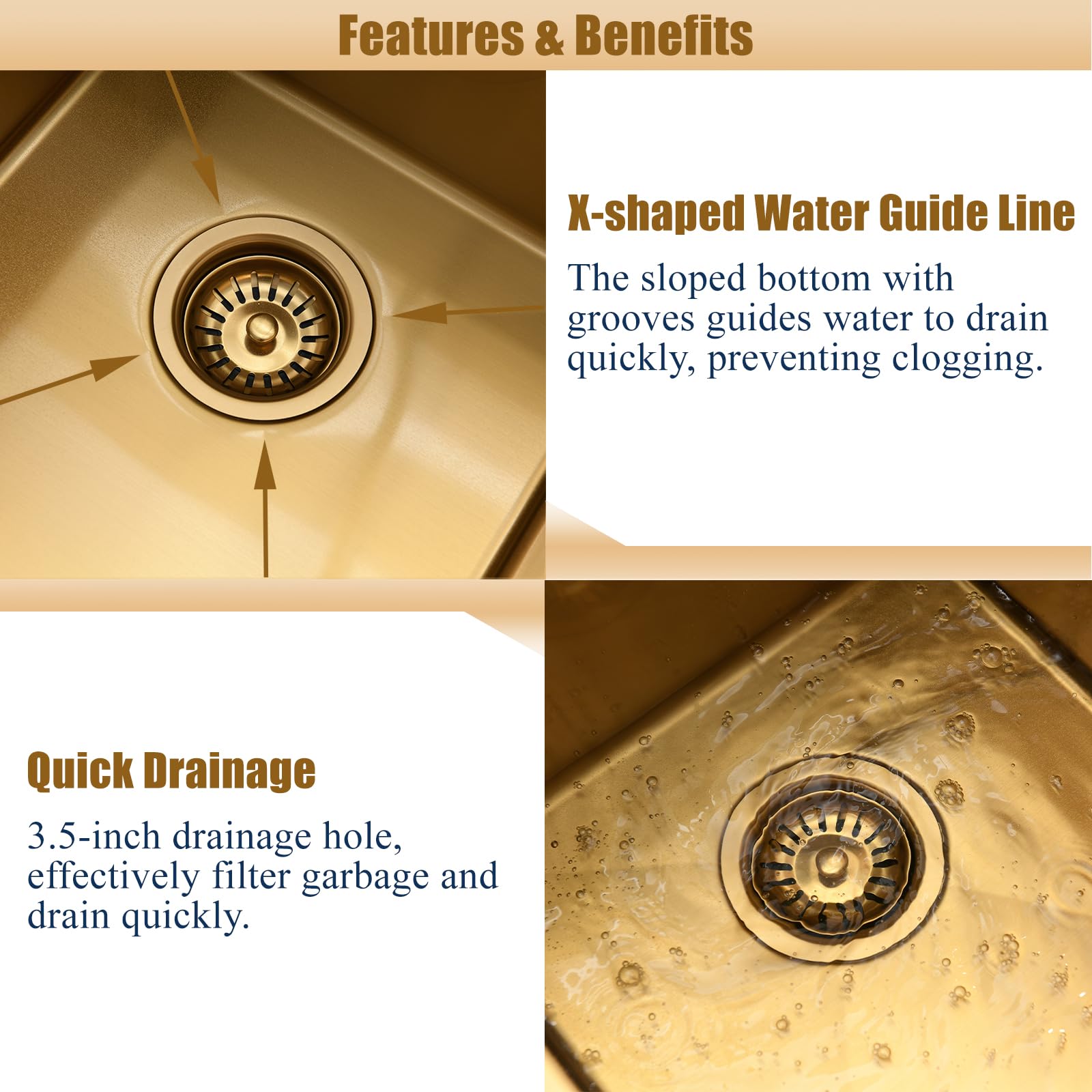 Bar Sink Outstanding Performance: The small bar sink gold features a slightly inclined bottom with an X waterline design, facilitating rapid waste water discharge and preventing accumulation.In addition, the gold small kitchen sink also adds a rounded corner design with a radius of 10mm, allowing for easy dirt-free cleaning in all directions.