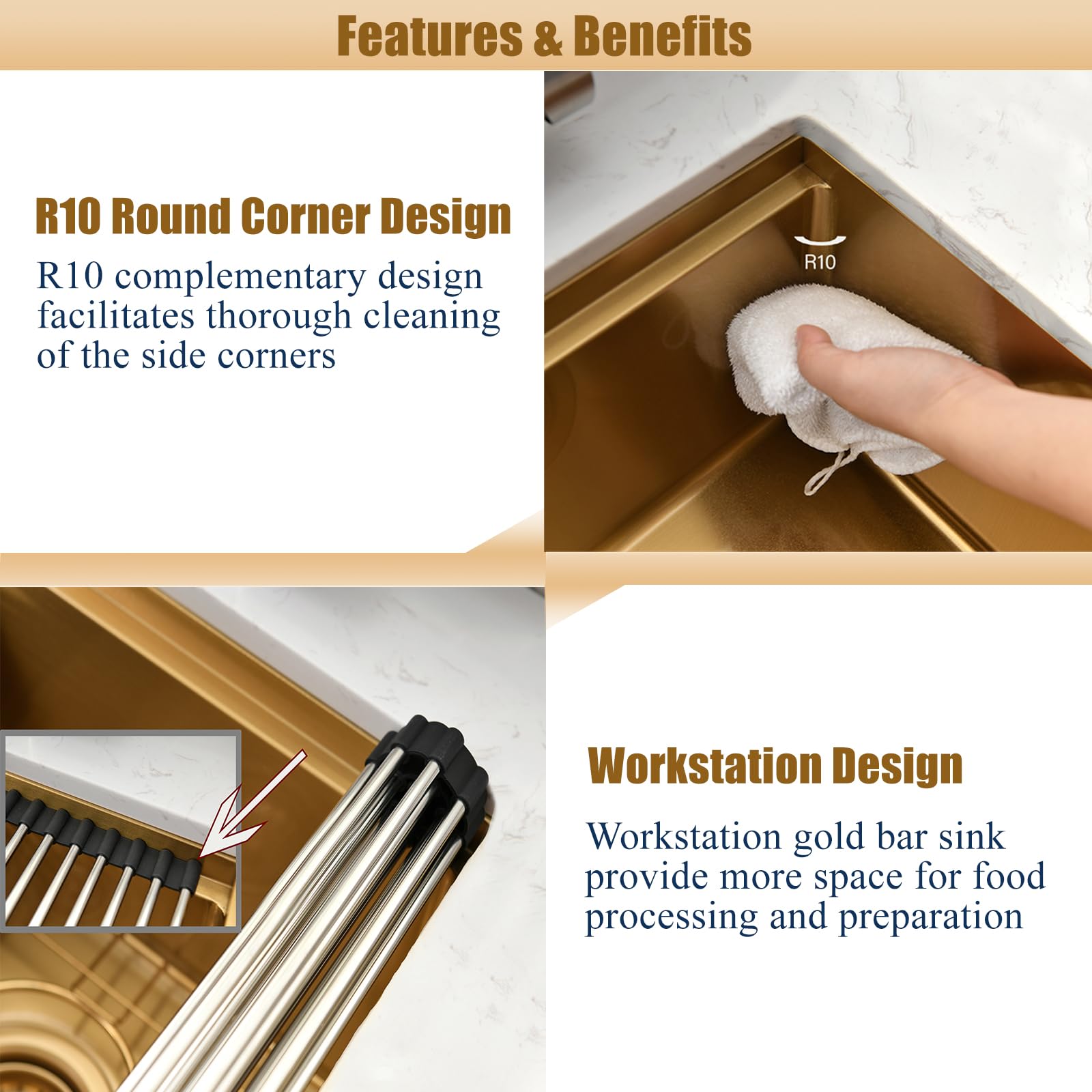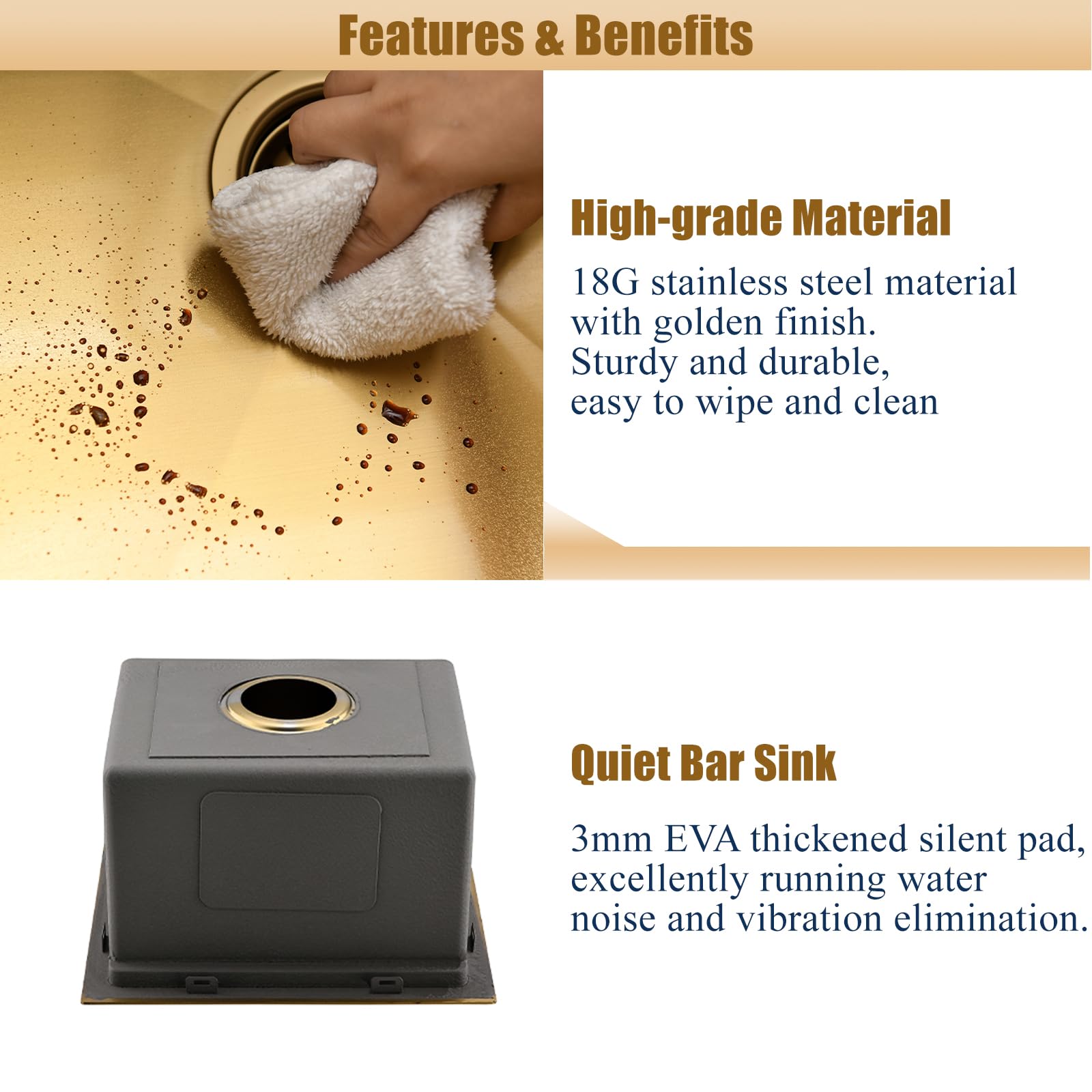 Premium Durable Material: This undermount gold bar sink is made of high-quality 18 gauge T-304 stainless steel with gold finished surface treatment, which effectively protects the sink surface from scratches and is easy to clean stains for durability.