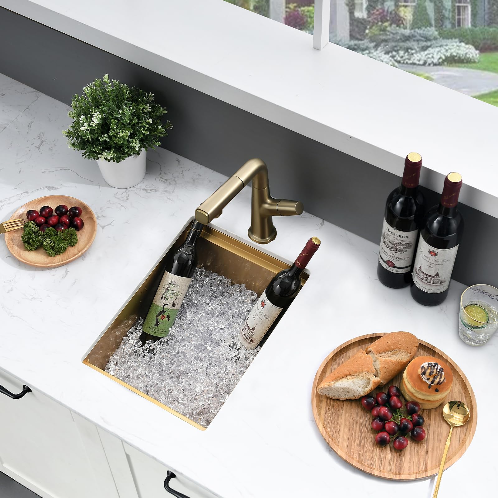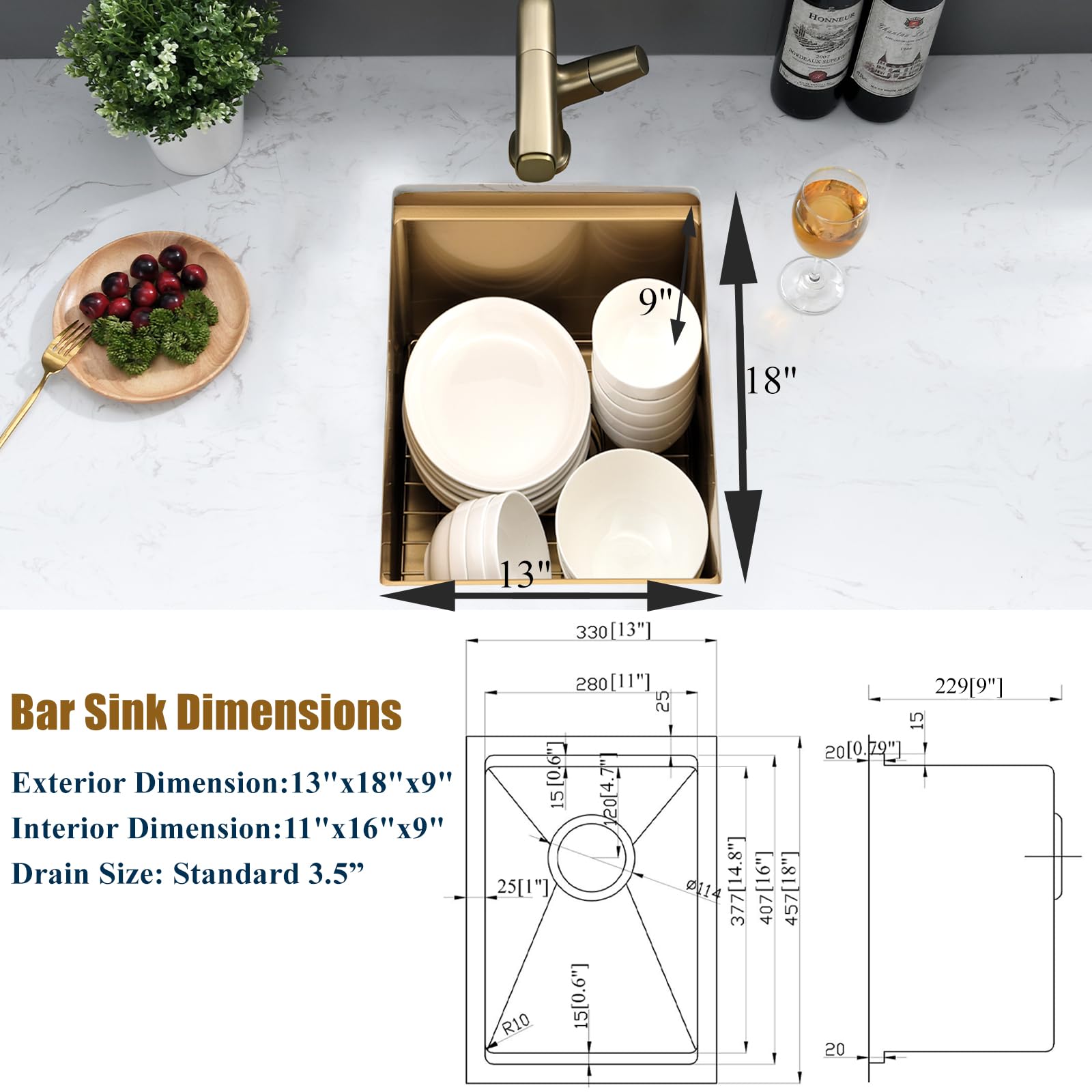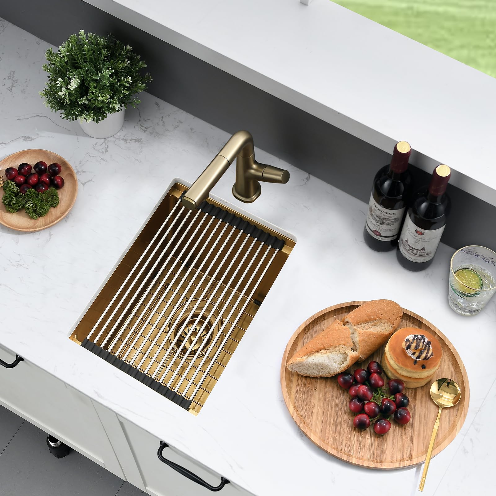Multifunctional Bar Prep Sink workstation: The 13 inch undermount bar sink gold has a built-in step in the front and back that, when combined with compatible accessories, forms a sliding track that can be quickly converted into a functional work space. Expand your workspace and simplify kitchen preparation and cleaning tasks. Make it versatile.