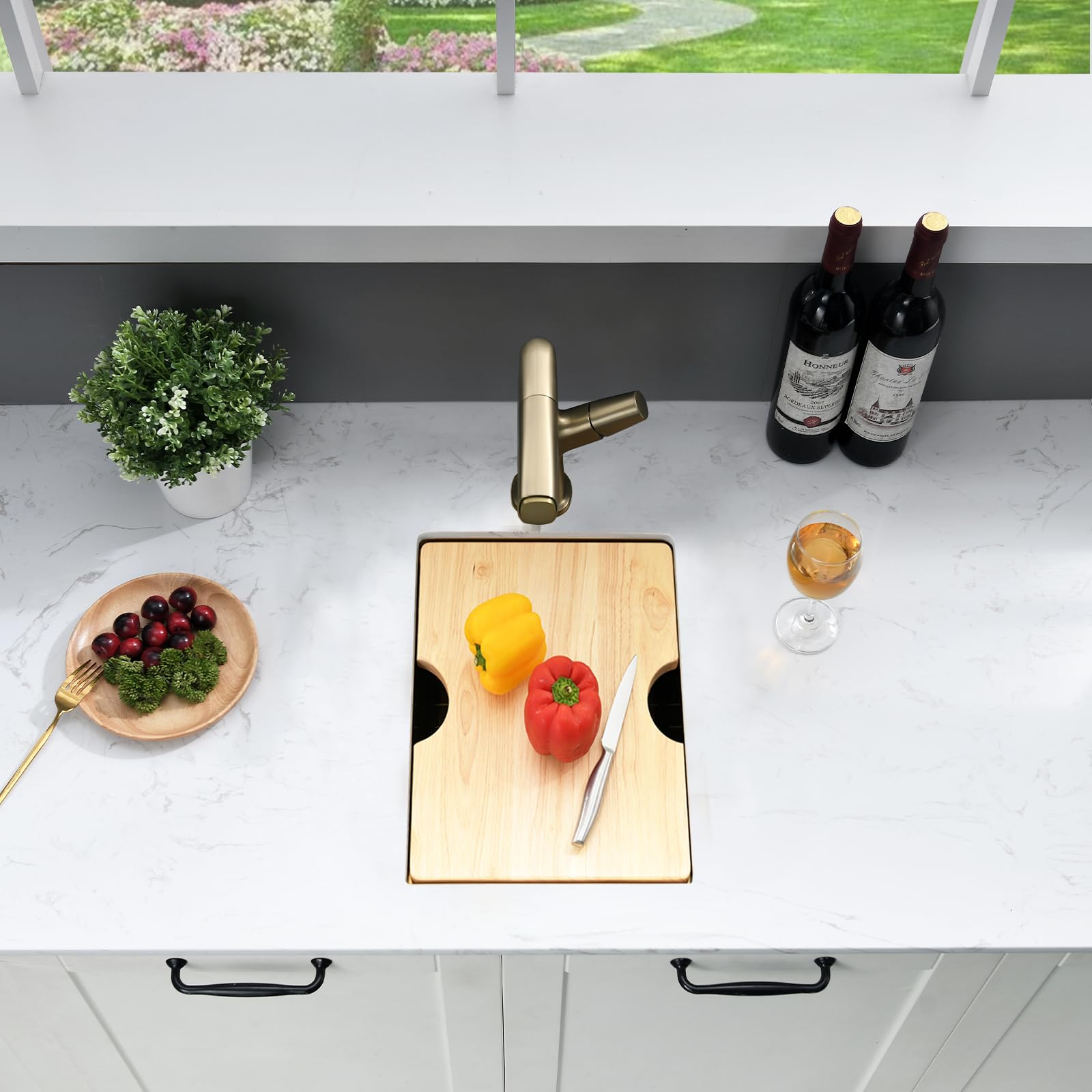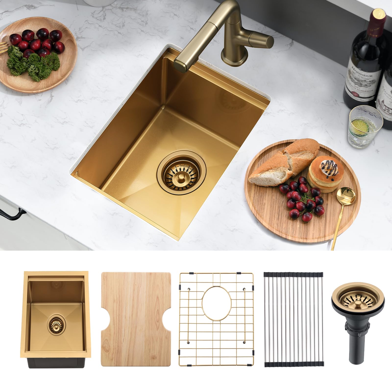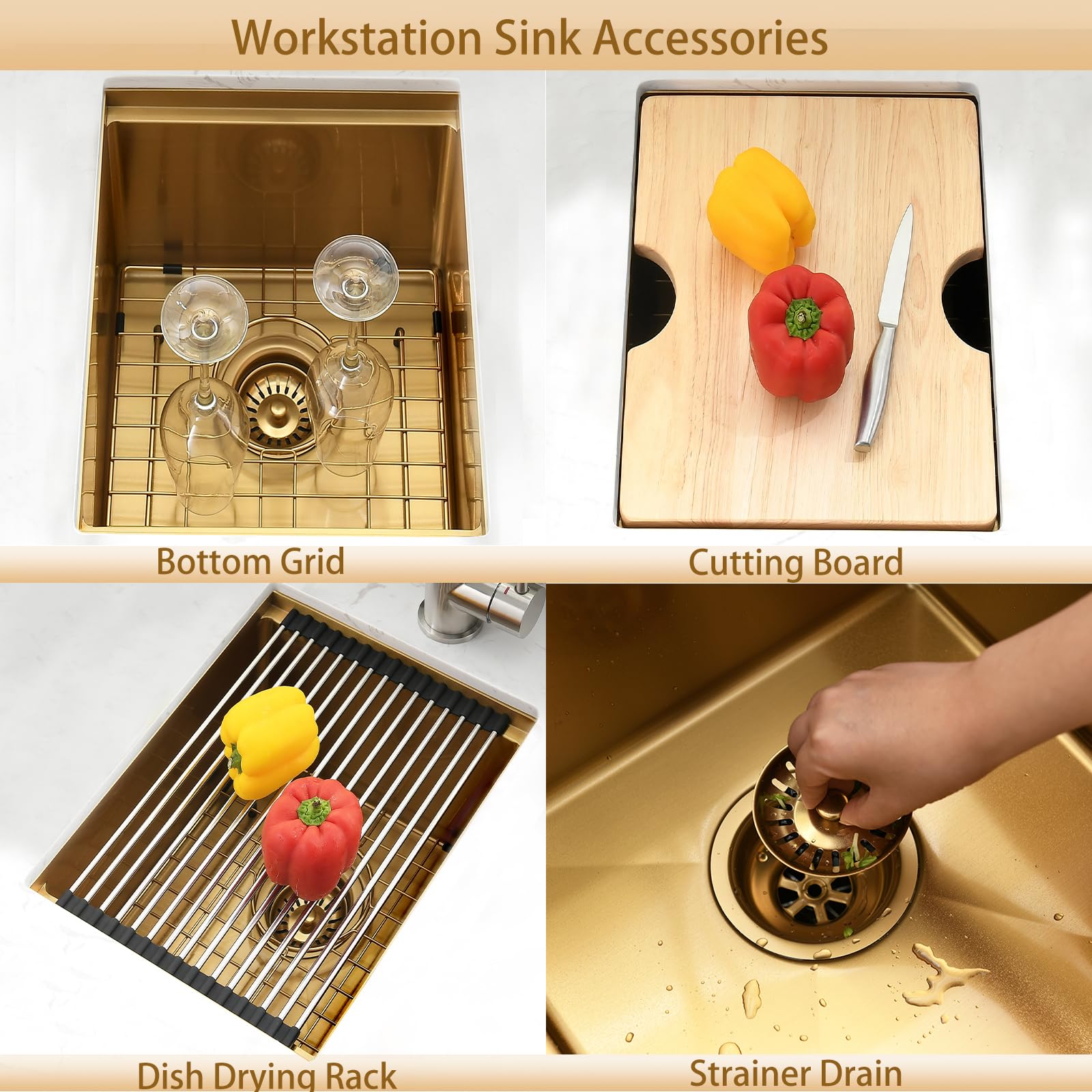 Multifunctional Bar Prep Sink workstation: The 13 inch undermount bar sink gold has a built-in step in the front and back that, when combined with compatible accessories, forms a sliding track that can be quickly converted into a functional work space. Expand your workspace and simplify kitchen preparation and cleaning tasks. Make it versatile.