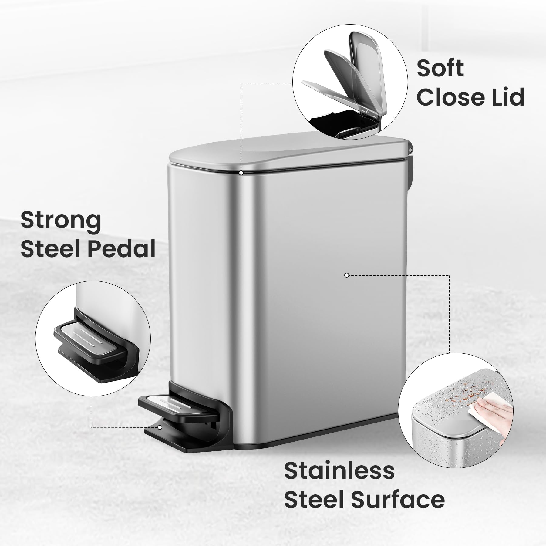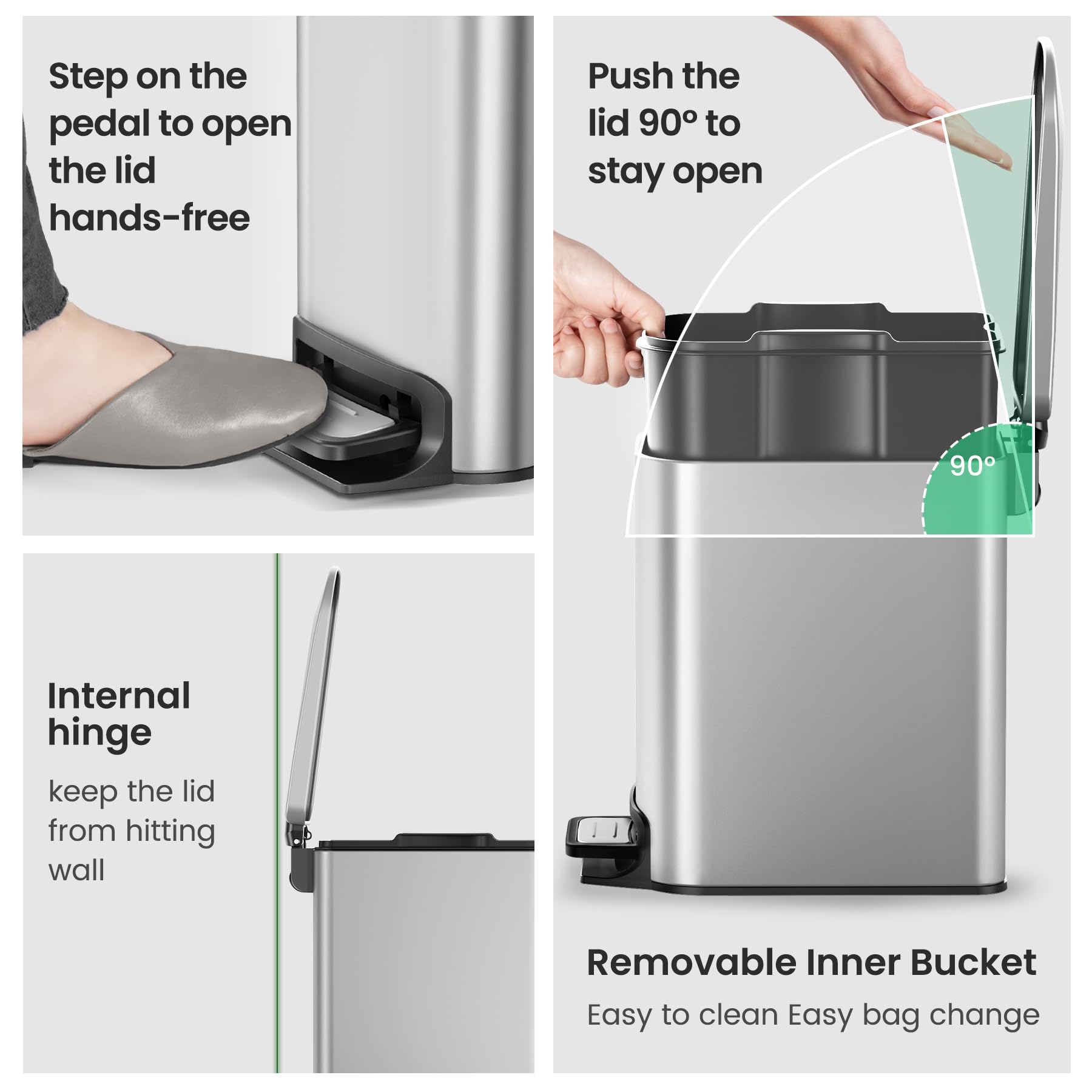 Sturdy Steel Pedal: Upgrade foot pedal of the bathroom trash can combines stainless steel tread with plastic material, making a lighter and more comfortable pedaling experience. Engineered to last over 150,000 steps, allowing you to step more than 20 steps a day for 20 years