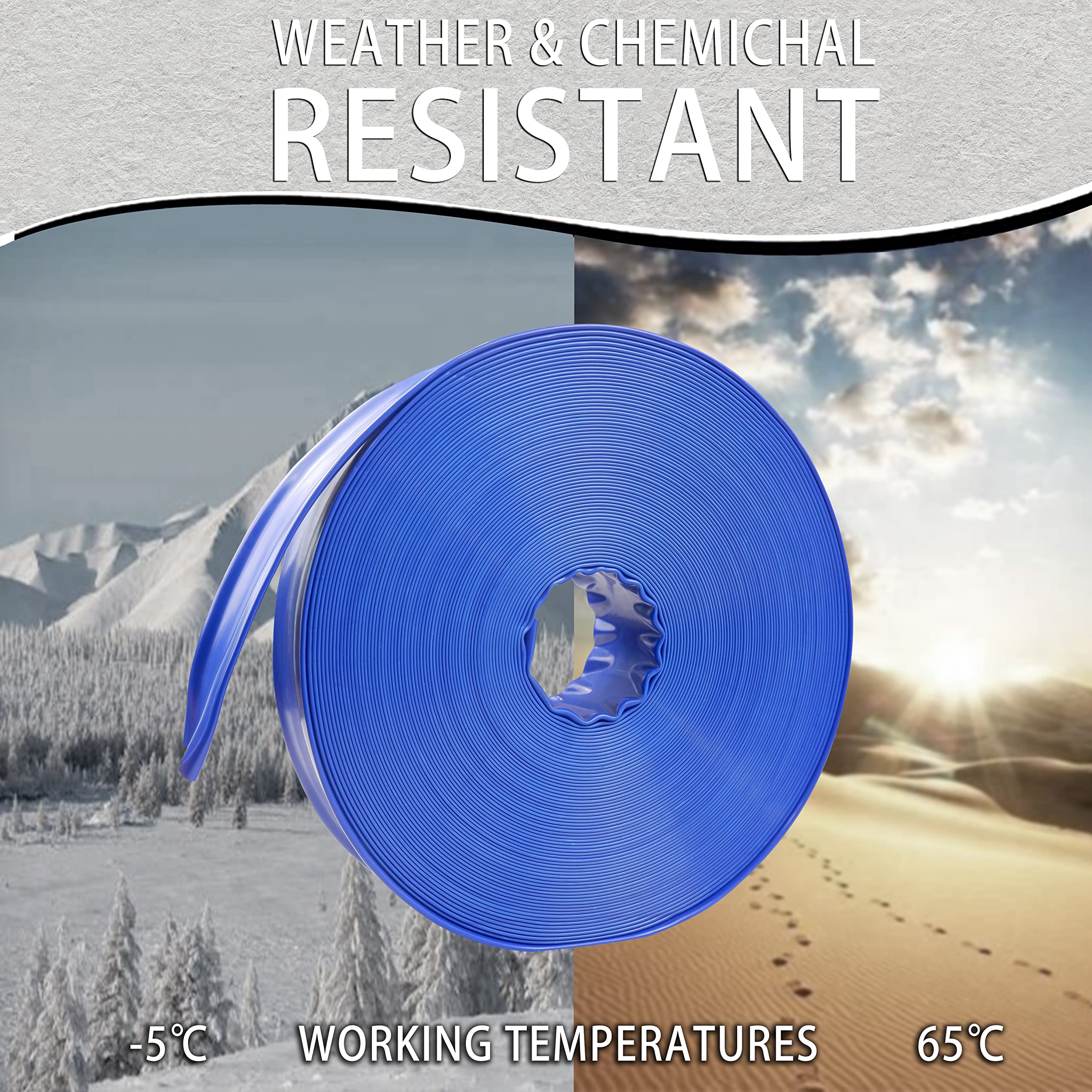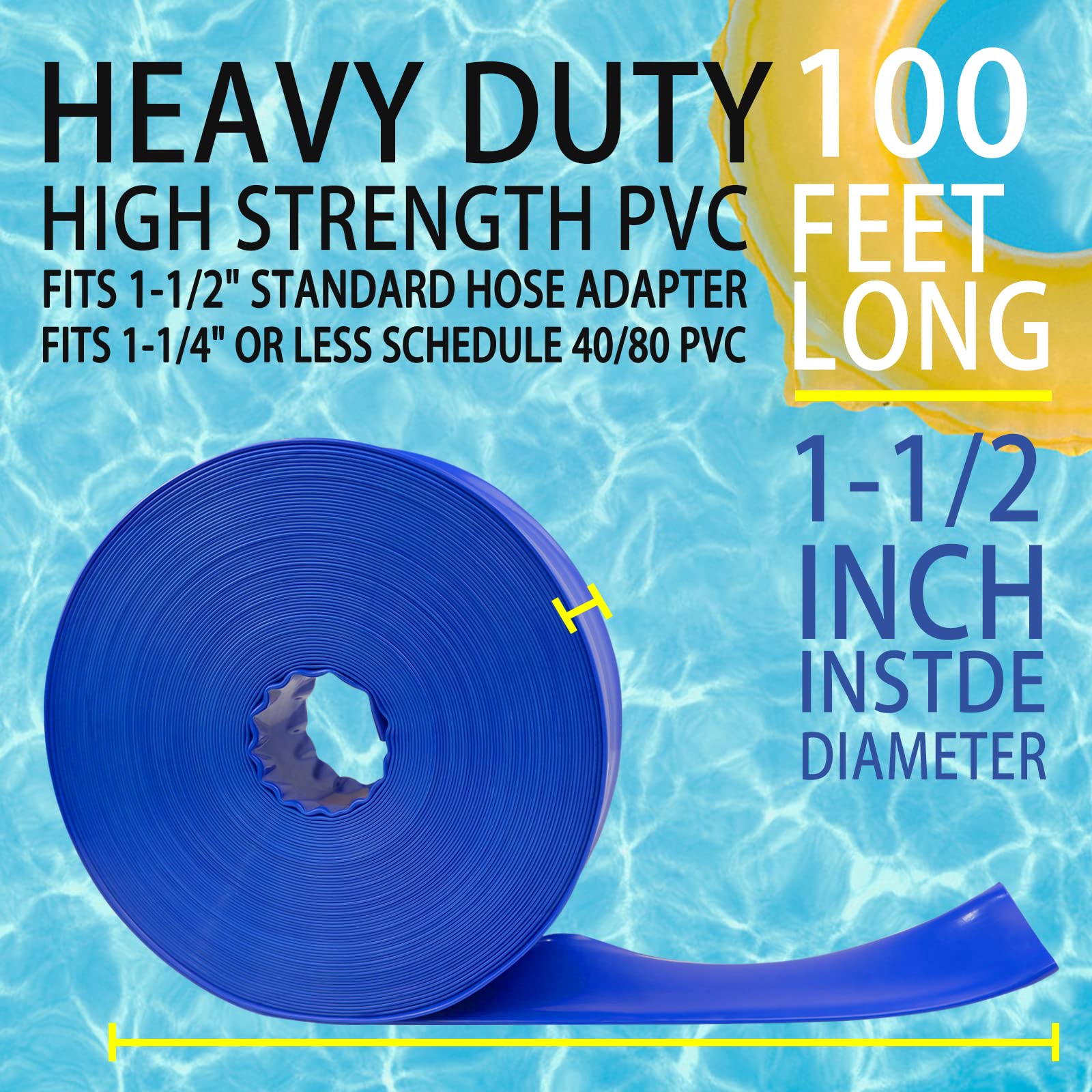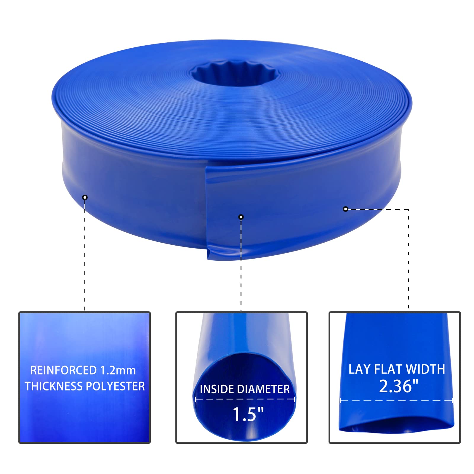 Discharging Hose Detail - Inside Diameter: 1.5inch; Inside width: 2.36inch; Length: 100 feet; Working pressure: 30PSI; Temperature Range : 23°F to 149°F (-5°C to 65°C); Hose fits 1.5” hose fittings; Heavy duty 0.025" (0.6mm) wall thickness