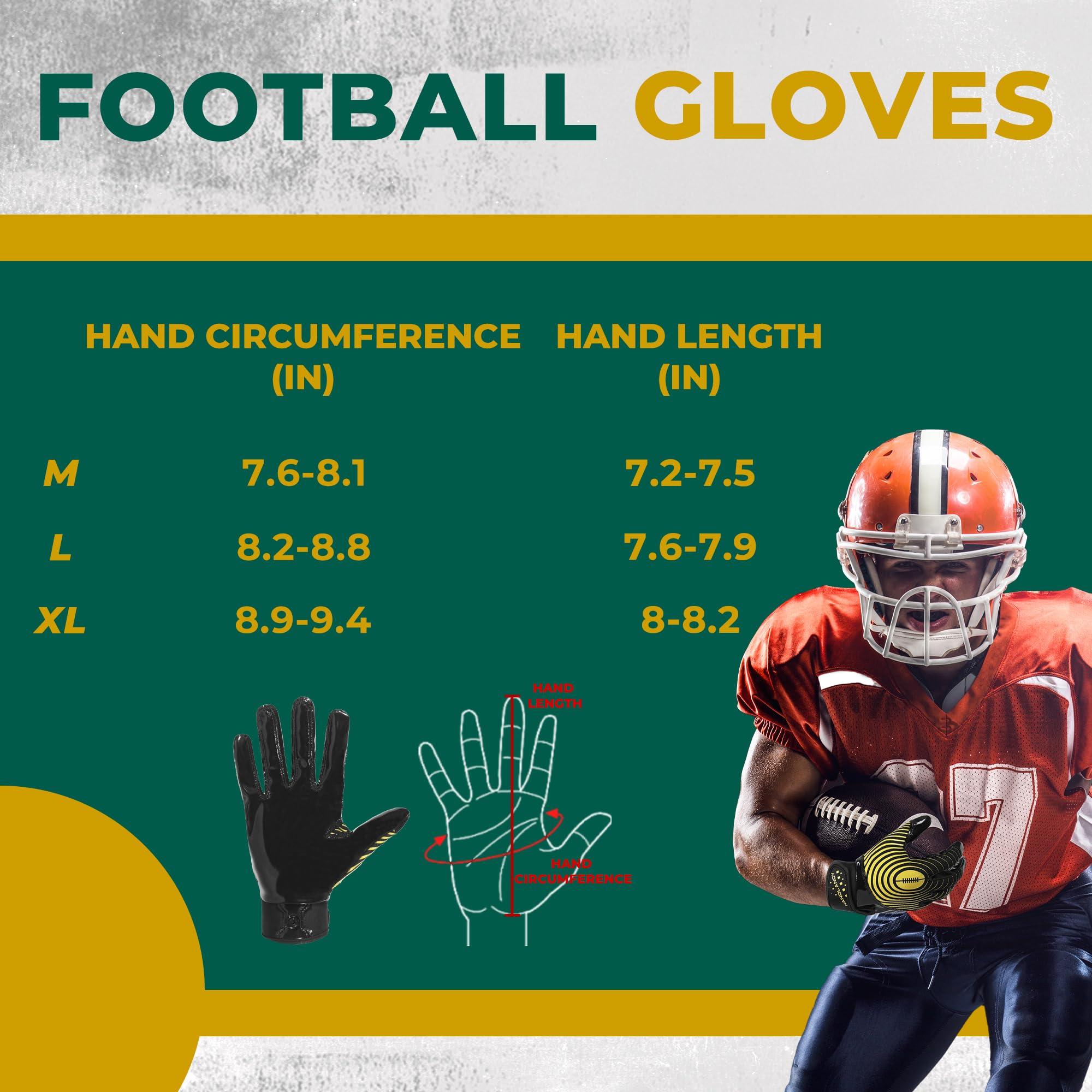 Amazing grip football gloves, keep the ball in hand : One piece tacky silicone palm design for an excellent grip to helps kids catch and hold on to footballs, durable and comfortable. These football gloves run LARGR in size, please choose fit football gloves according to the size chart in the pictutr 6th.