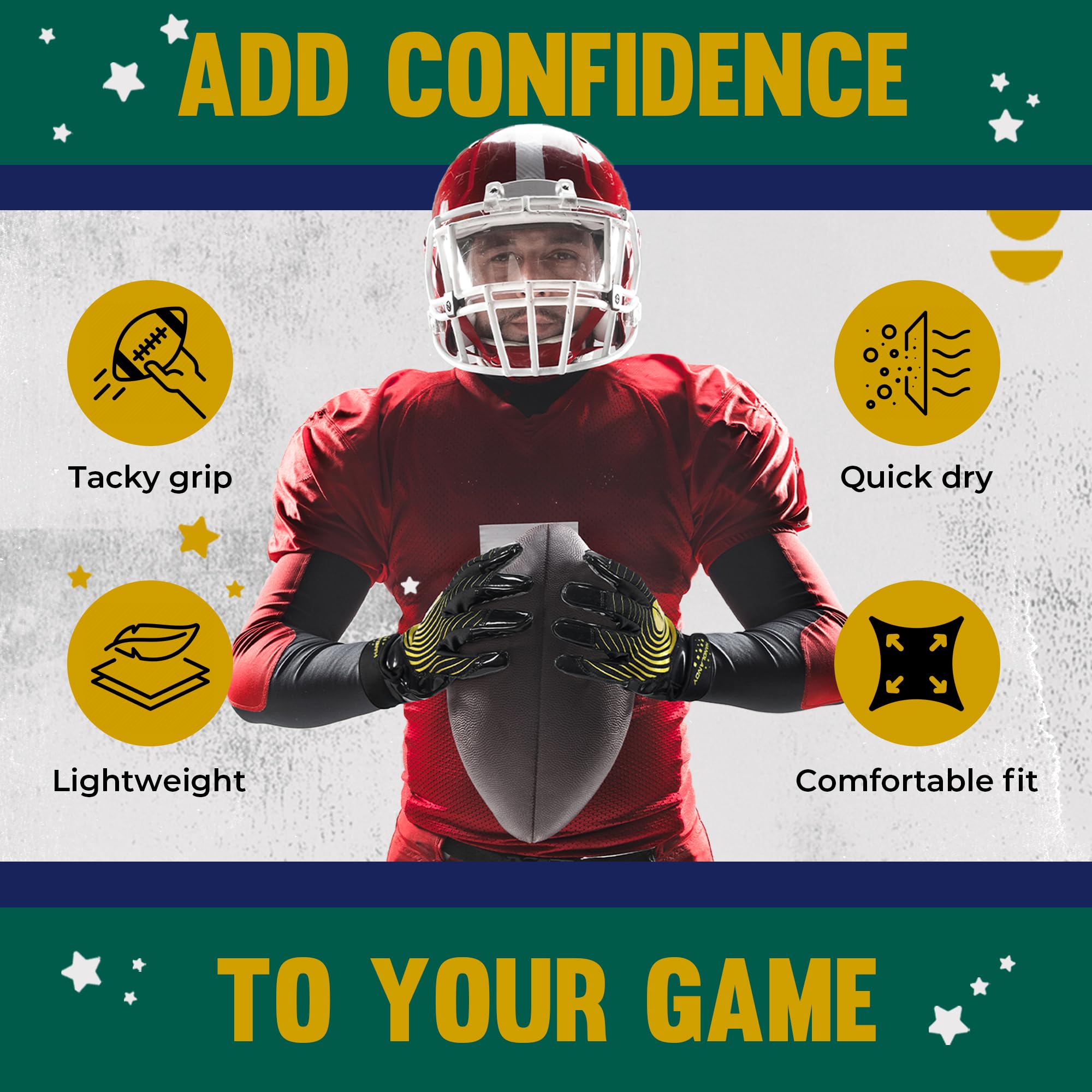 Flexible & breathable football gloves: Stretchable quick & dry Spandex back and comfortable lining to keep the hands cool and dry on the practice or game, comfortable fit and doesn’t make hands sweat.