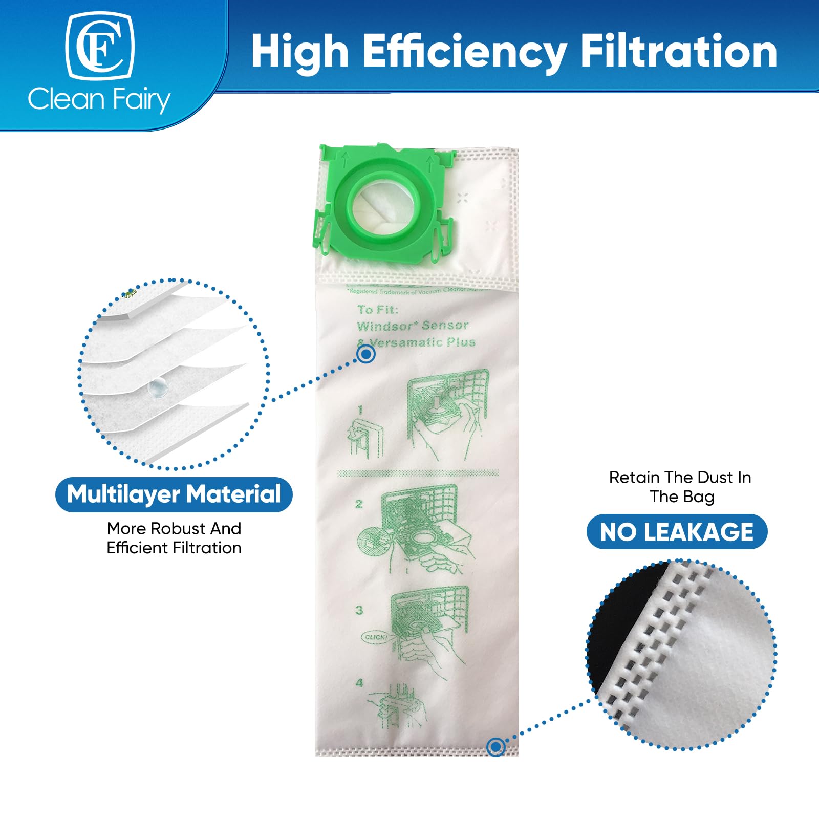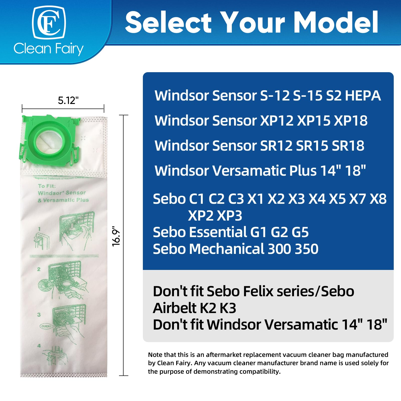 Note that this is an aftermarket replacement vacuum cleaner bag manufactured by Clean Fairy. Any vacuum cleaner manufacturer brand name is used solely for the purpose of demonstrating compatibility
