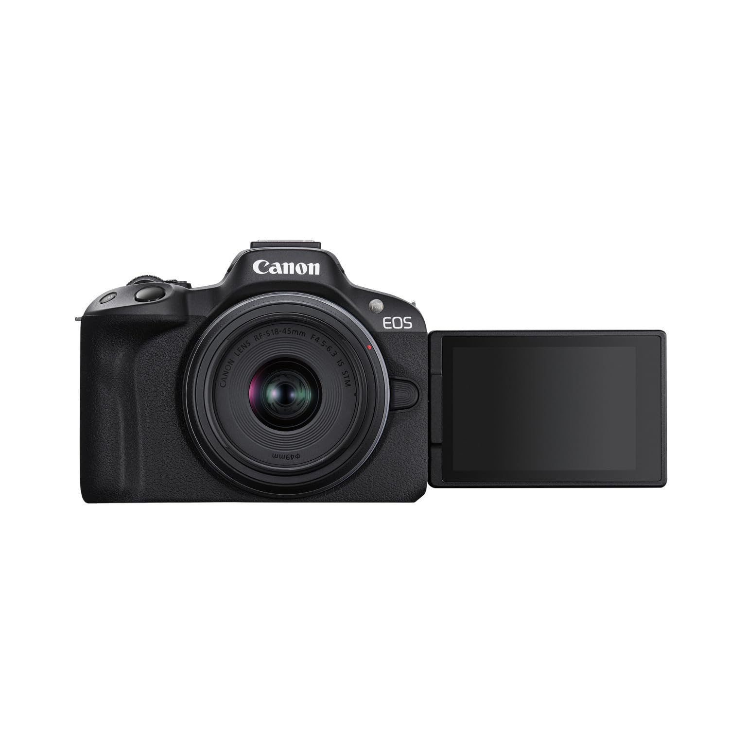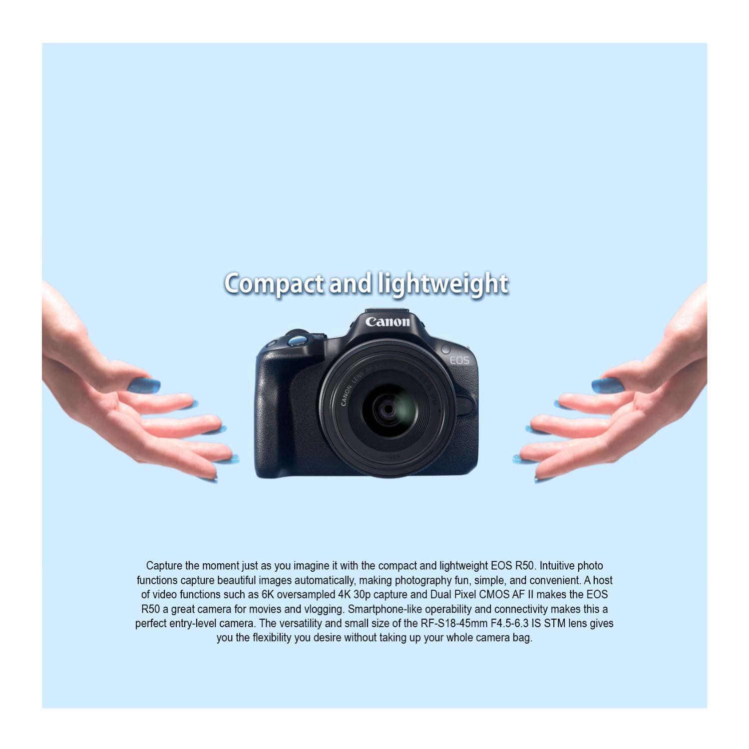 Canon EOS R50 Mirrorless Camera with 18-45mm Lens (Black) The Canon EOS R50 is a compact, easy-to-use mirrorless camera featuring a 24.2MP APS-C sensor, fast and accurate autofocus with subject tracking, and high-quality 4K video recording, making it an excellent choice for beginners, vloggers, and content creators. With wireless sharing, smartphone-style controls, and a lightweight design, it's perfect for capturing and sharing great content on the go. Koah Nostrand Avenue Camera System Gadget Bag with Accessory and Cleaning Kit The Koah Nostrand Avenue Camera Bag is a semi-soft case that holds a DSLR, two lenses, and accessories, featuring weather protection, quick-access zippers, extra pockets, a shoulder strap, and a full cleaning kit for maintaining optical gear. 128GB SD Premium Performance Class 10 UHS-I U1 V10 Full HD Memory Card with Up to 25MB/s Speed The 128GB Class 10 UHS-I U1 SDXC Memory Card offers reliable performance for Full HD video recording and high-resolution photography. With a UHS Speed Class 1 (U1) and Video Speed Class 10 (V10) rating, it supports smooth 1080p video capture. It provides up to 25MB/s write speed for efficient photo shooting and up to 85MB/s read speed for fast file transfers. Its 128GB capacity ensures ample space for storing numerous videos and images, making it an ideal choice for bridge and DSLR cameras. Bundle Includes: Canon EOS R50 Mirrorless Camera with 18-45mm Lens (Black) Koah Nostrand Avenue Camera System Gadget Bag with Accessory and Cleaning Kit 128GB SD Premium Performance Class 10 UHS-I U1 V10 Full HD Memory Card with Up to 25MB/s Speed