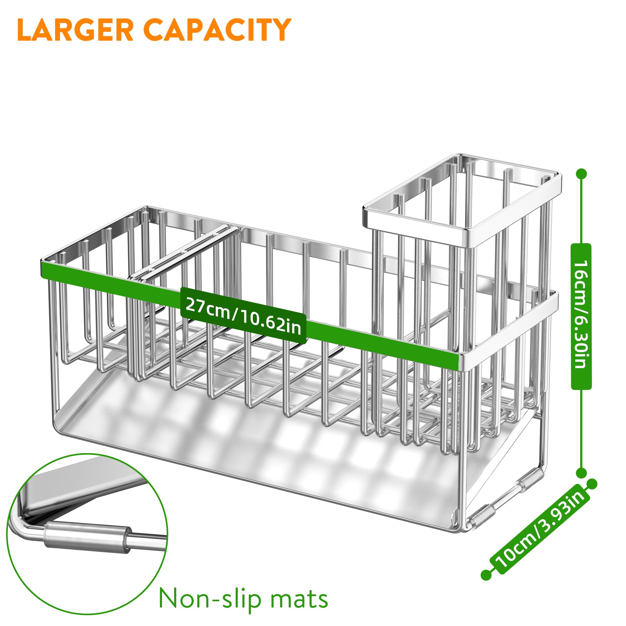 【EXTENDED AND LARGER CAPACITY】Cisily sponge holder has upgraded size. The size is only 10.62 inches * 3.97 inches * 6.37 inches, which can accommodate detergent bottles, sponge balls and sink plugs. Cisily sink organizer is additionally upgraded with a brush holder, which can hold up to 4 large and small brushes, perfectly saving countertop space.