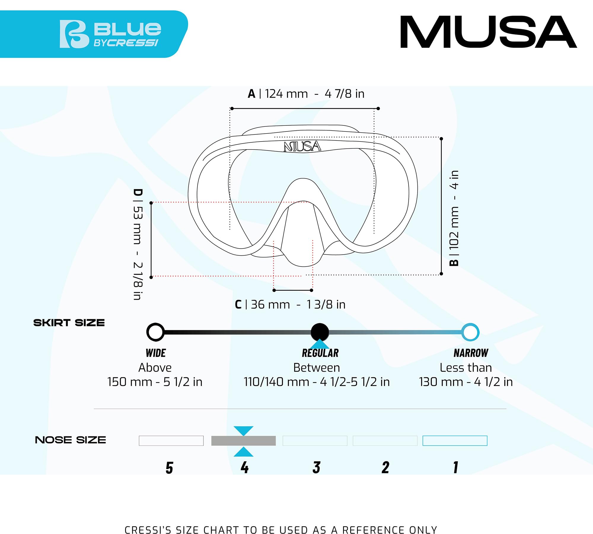 The Musa mask is a cutting-edge, frameless design that combines low internal volume with an expansive field of view. Its innovative construction involves the direct assembly of the silicone skirt onto the single-tempered glass lens, ensuring exceptional sturdiness and a perfect watertight seal. Lightweight and compact, the Musa is ideal for travel and packing. The mask’s flexible fit and reduced drag make it highly appreciated by freedivers, spearfishers, snorkelers, and divers alike, making it an excellent choice for any underwater adventure. The single-tempered glass lens offers a wide field of vision, enhancing the wearer’s experience of the underwater world. Additionally, the micro-metrically adjustable buckles are both comfortable and effective, allowing for quick and easy adjustments. The Musa is designed in Italy by Cressi and made in China. Cressi has been an Italian brand pioneer in scuba diving, freediving, and snorkeling equipment since 1946. The product is covered by a 2-year limited warranty.