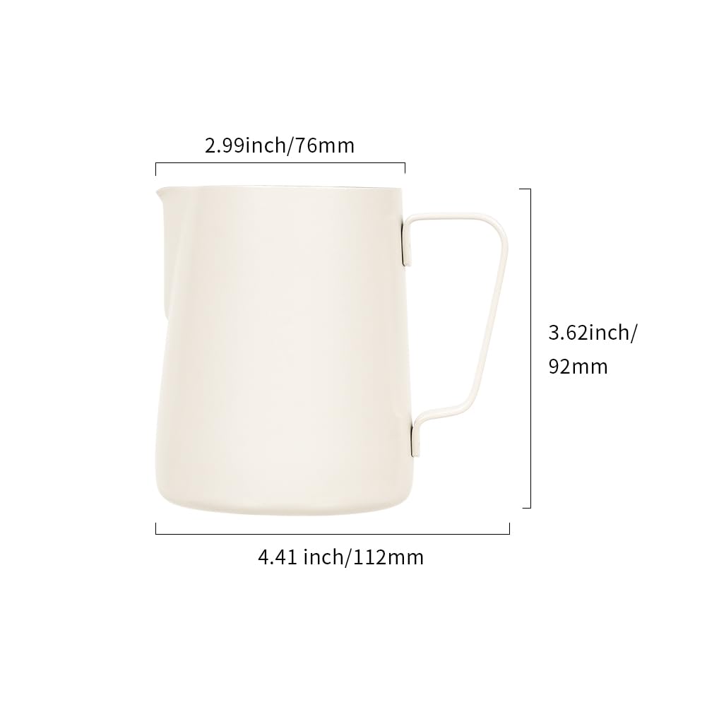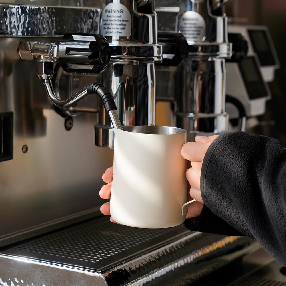 PREMIUM MATERIAL: watchget milk frothing pitcher is made of food grade 304 stainless steel with creamy white coating which is durable and sturdy, wear-resistant and heat resistant. Unbreakable for daily use and can serve you a long time. Easy to clean and use, it offers excellent temperature control.