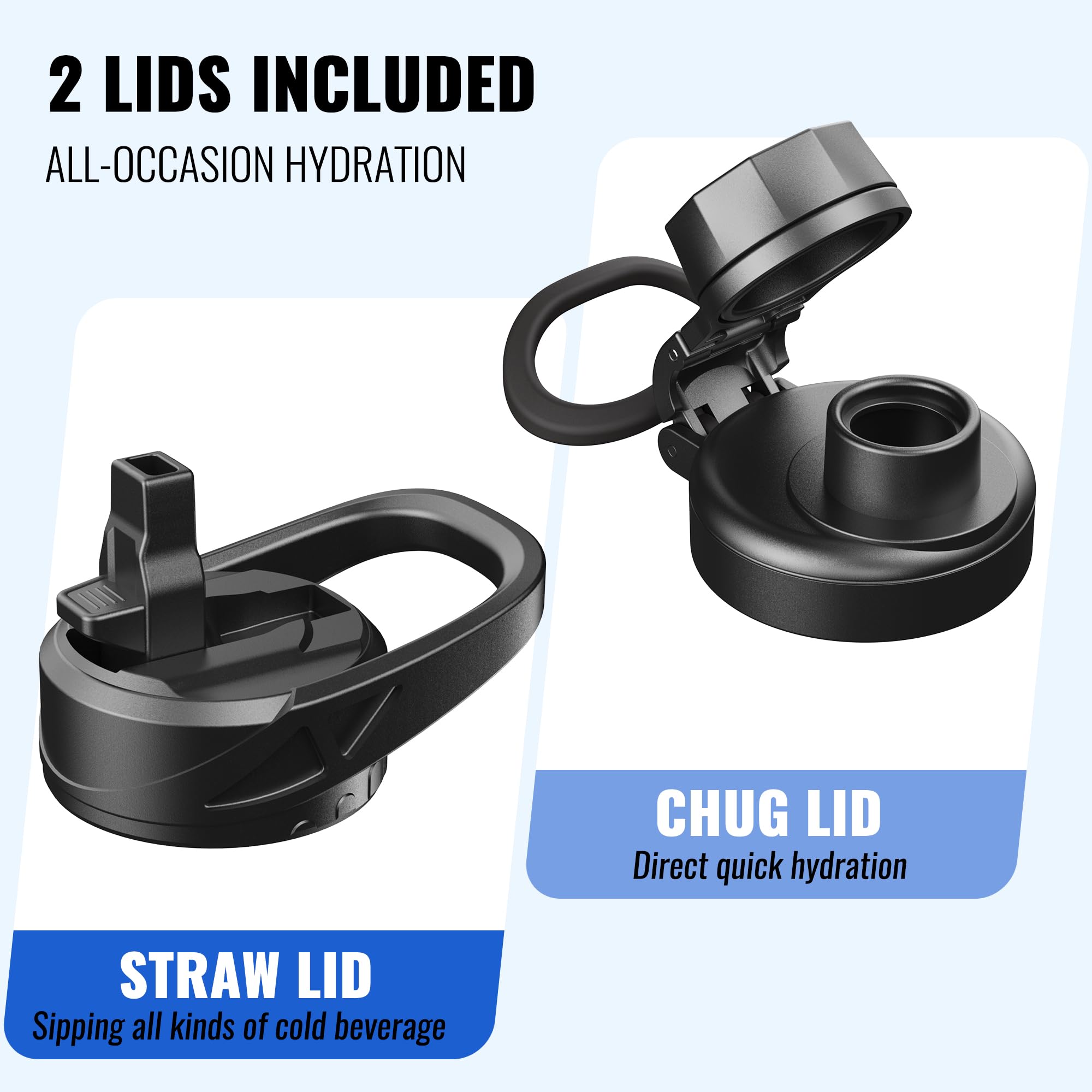 TWO DIFFERENT LIDS DESIGN: The motivational water bottle is equipped with 2 wide-mouth lids, 1 flip-up straw lid and 1 easy-twist spout lid, All caps allow for easy one-handed or hands-free sipping when you are busy or on-the-go
