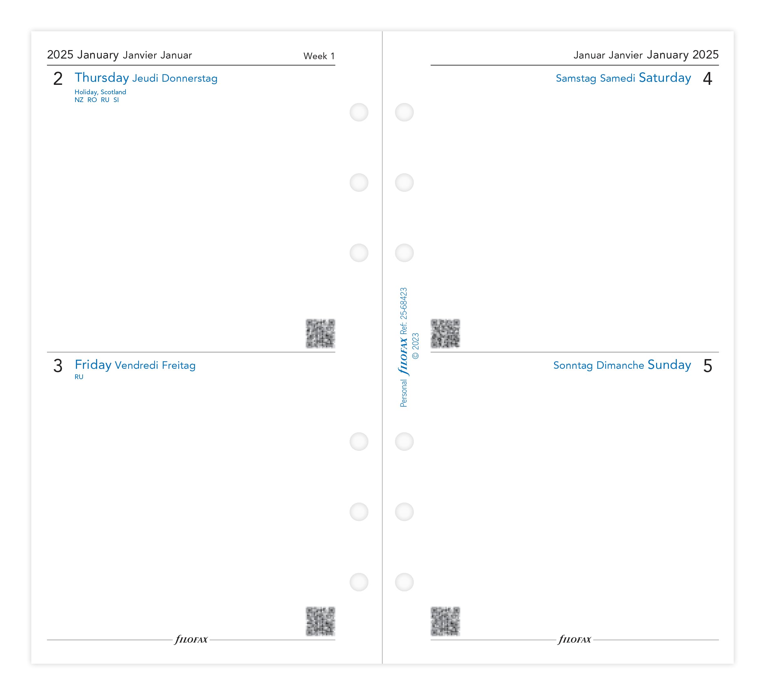 This Filofax Personal 2025 diary refill features a QR code on every day which, when used together with the Filofax Reminder App, allows you to plan on paper and review on your phone. Simply download the free Filofax Reminder app and scan the QR code on the date of your choice. This will allow you to not only copy appointments from your diary onto the App, but also set up reminders. The appointments can also be synced with your phone's calendar. This innovation will allow you to always have the important contents of your diary with you. This is a Filofax Personal two days per page 2025 diary refill, printed in English, French and German on white paper. The year runs from January to December 2025. Paper size 95mm x 171mm, punched with 6 round holes.